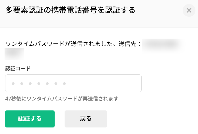 設定した携帯番号に送信された認証コードを入力し、「認証する」をクリックします。