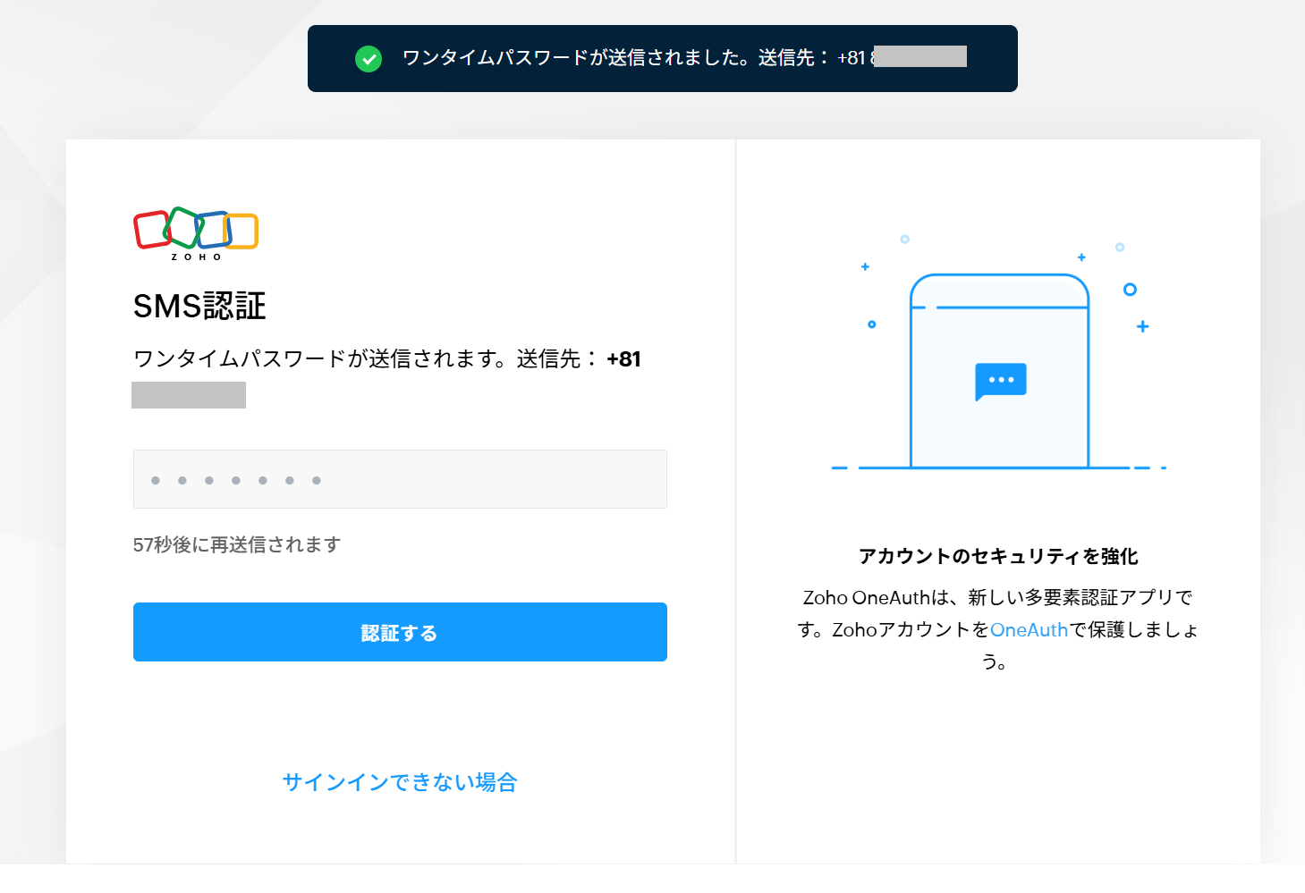 【Zoho Accounts】二段階認証/多要素認証:「SMSで送信するワンタイムパスワード」認証に変更