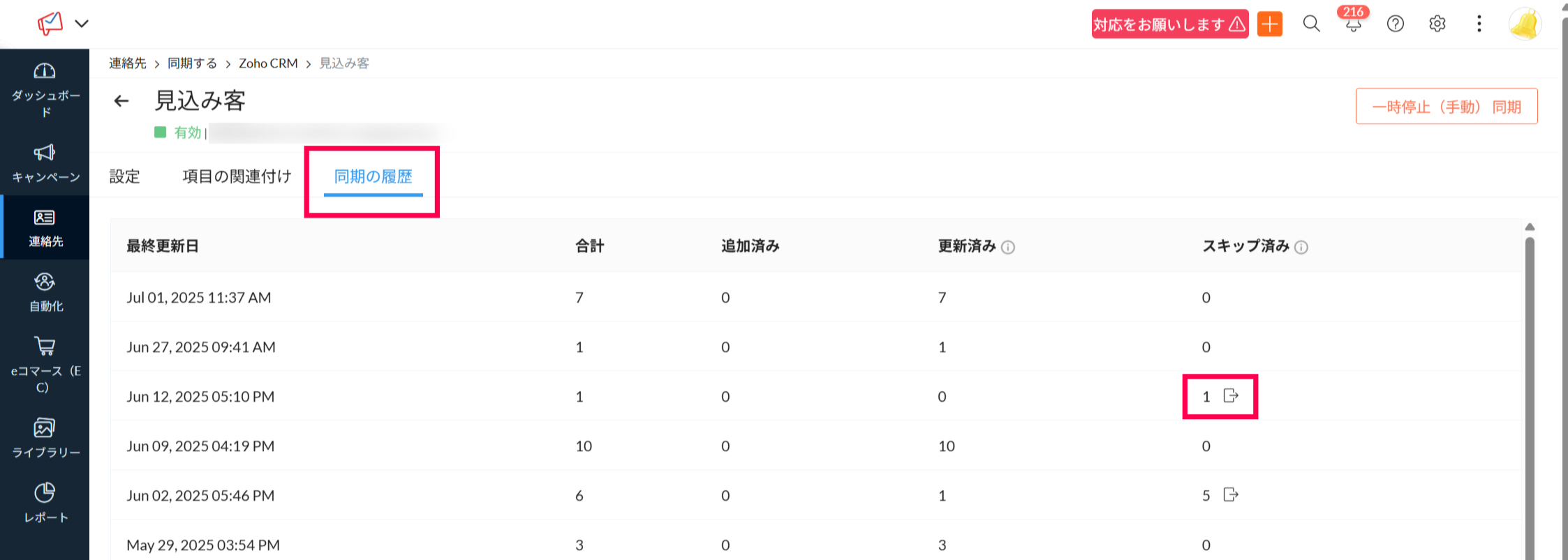 同期の詳細結果は、連絡先>サービス同期>Zoho CRM>有効な同期>任意の同期名>同期の履歴画面から確認可能です。