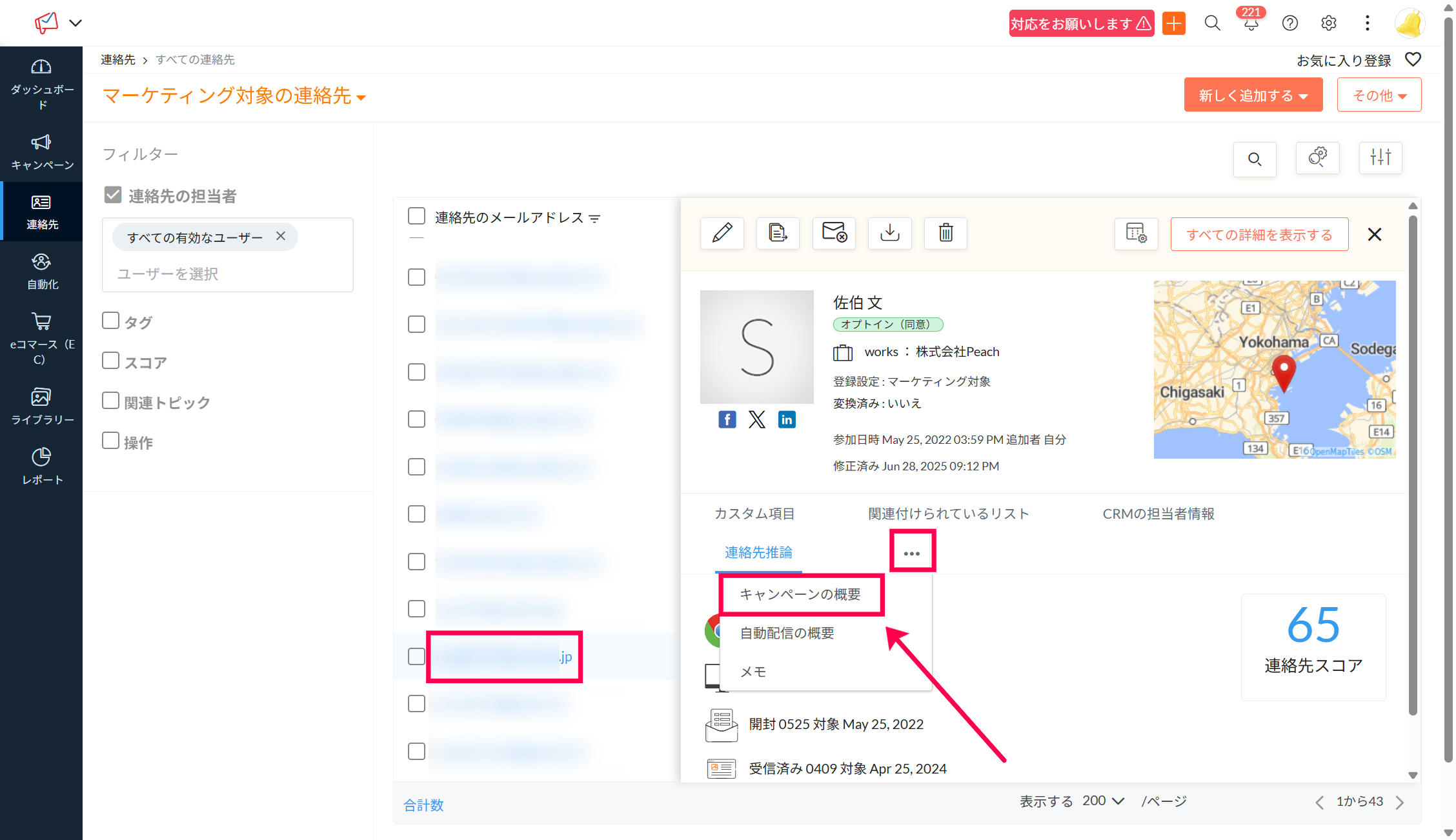 3)選択した連絡先の詳細画面画面内の・・・をクリックし、ドロップダウンリストから「キャンペーンの概要」をクリックすると、送信したキャンペーンの概要を確認できます