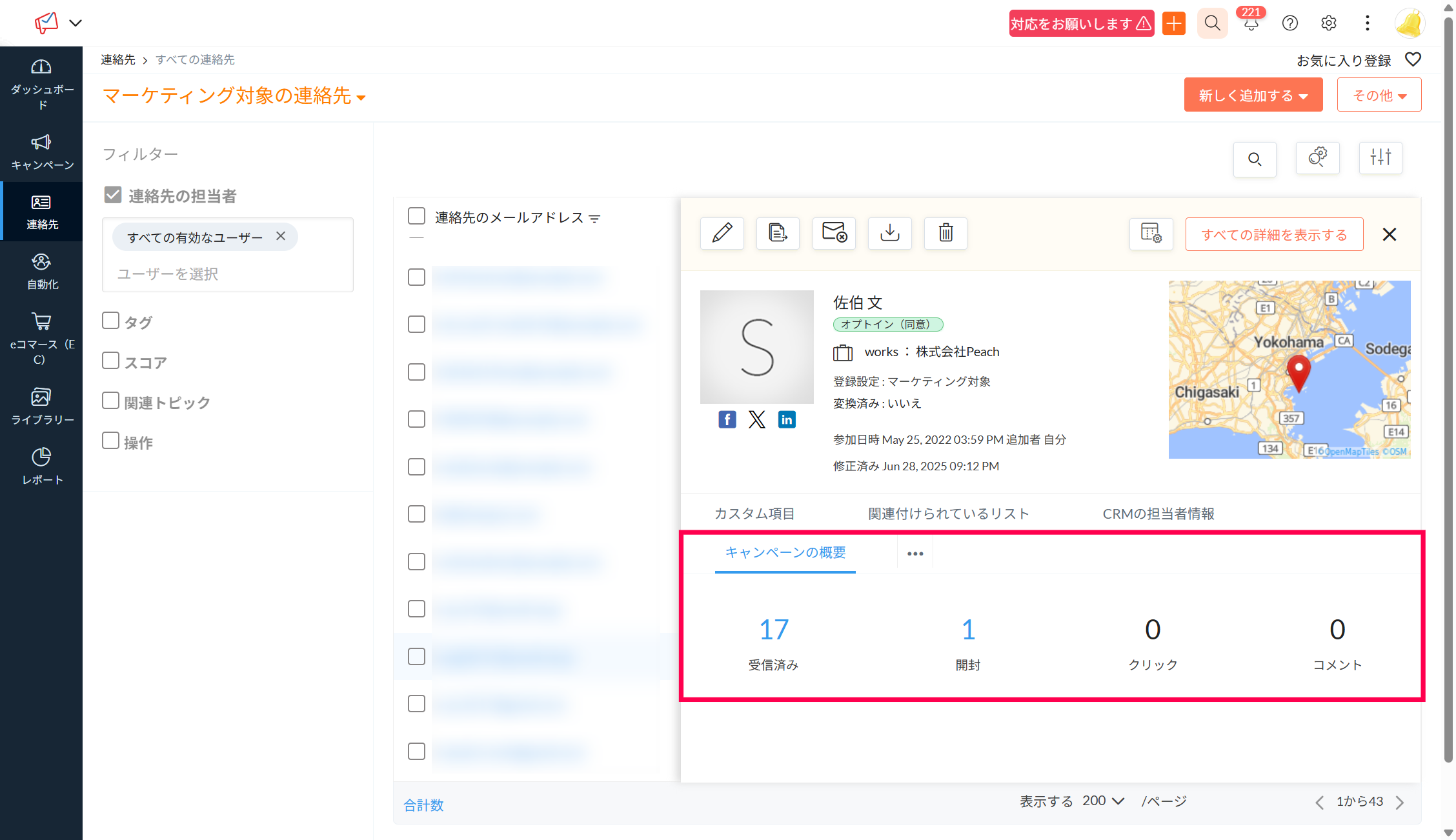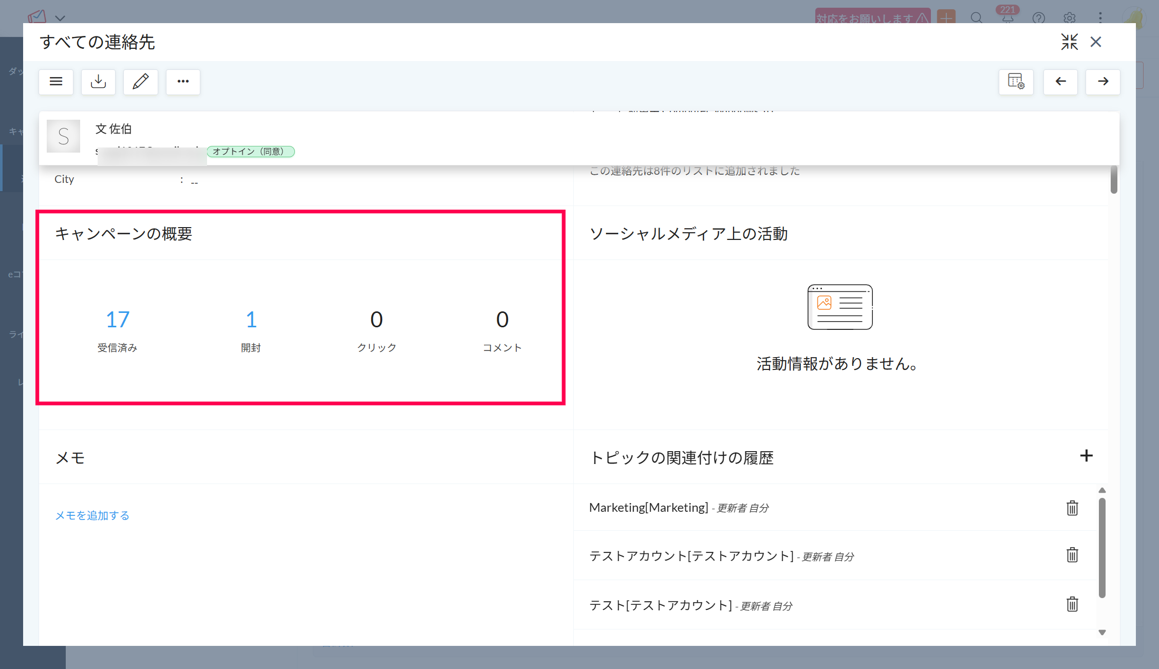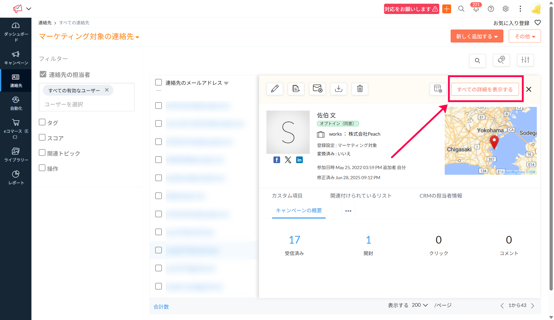 また、「キャンペーンの概要」は、連絡先の詳細画面内右上にある「すべての詳細を表示する」ボタンをクリック後、画面を下にスクロールした際にも確認可能です。