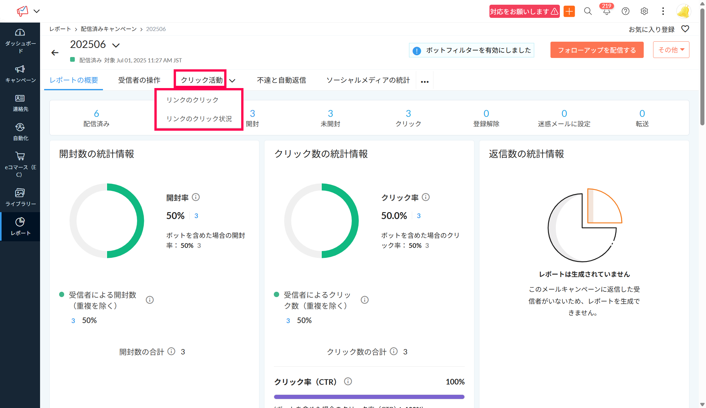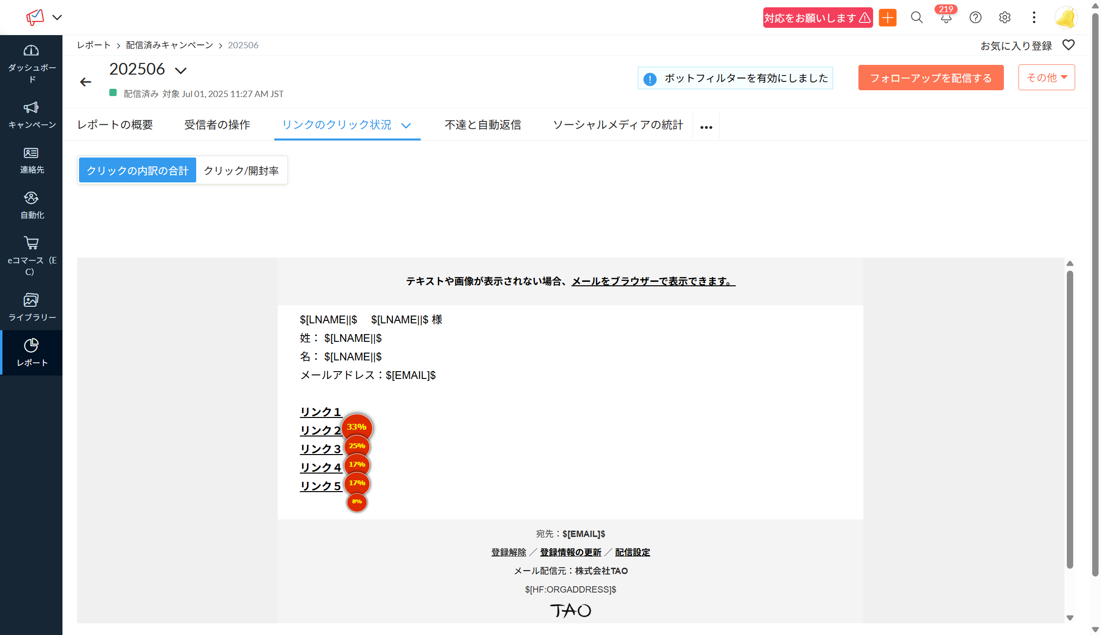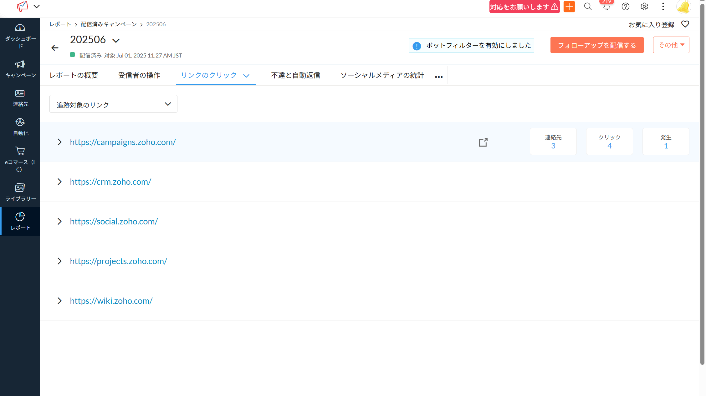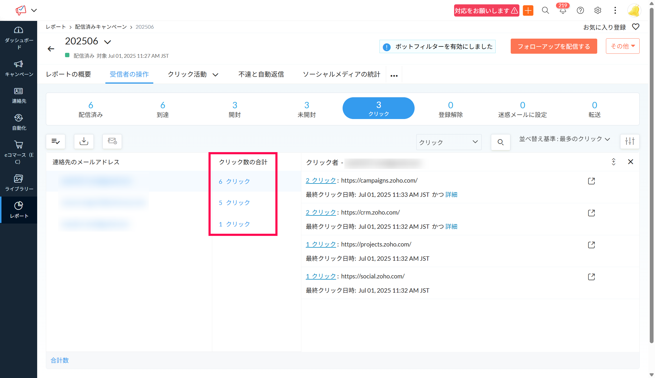 【Zoho Campaigns】送信キャンペーンメール内のリンクをクリックした連絡先を確認する方法