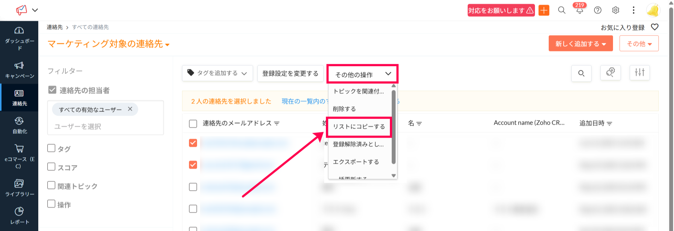 【Zoho Campaigns】連絡先の一覧からリストに追加(=コピー)する方法
