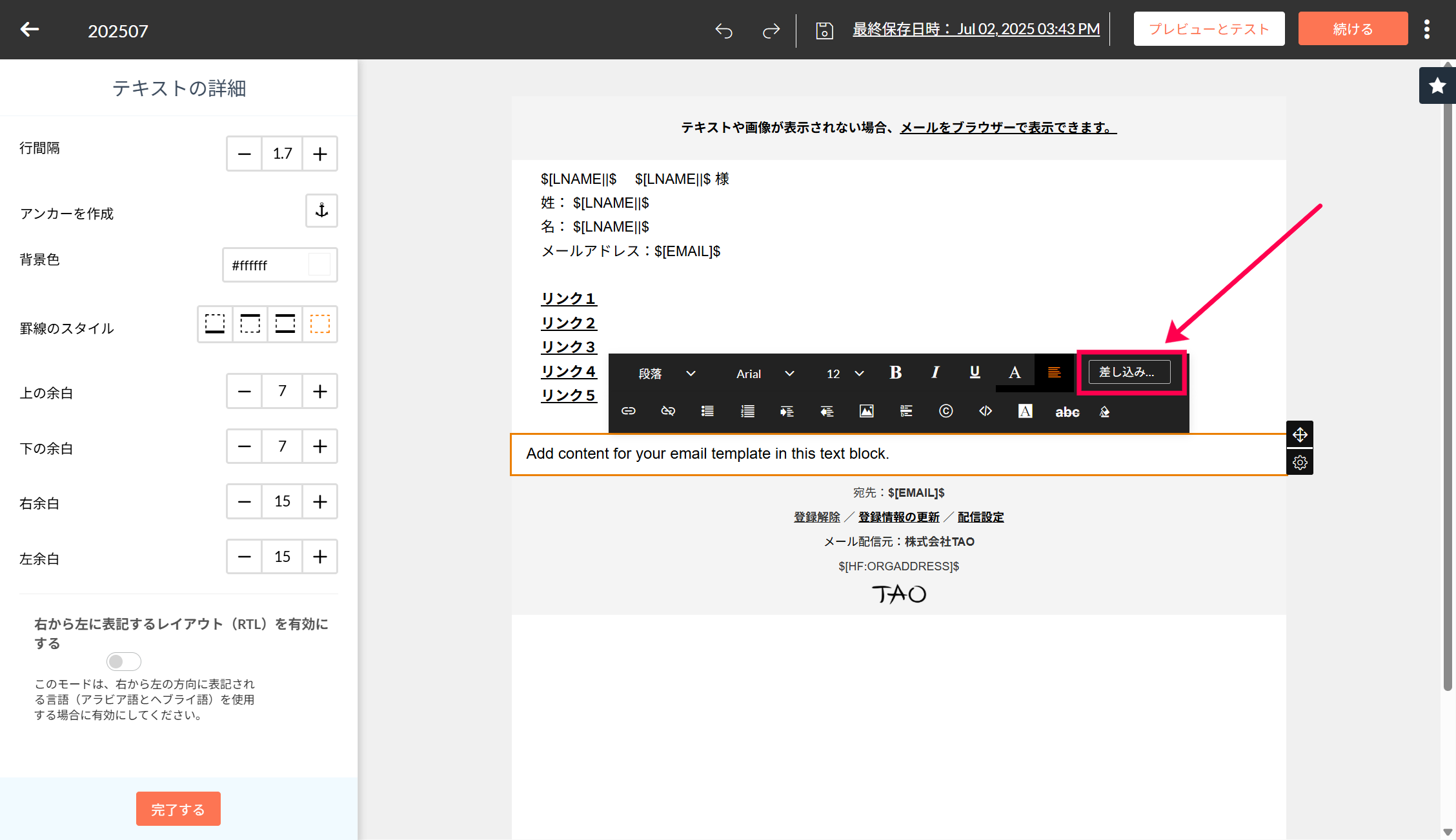 2)テキスト欄上のメニュー内に表示されている「差し込みタグ」をクリックします