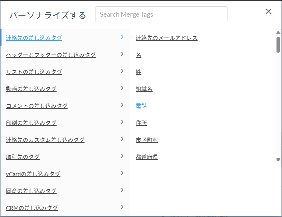 3)一覧に表示される差し込みタグの中から、挿入したいタグをクリックします。