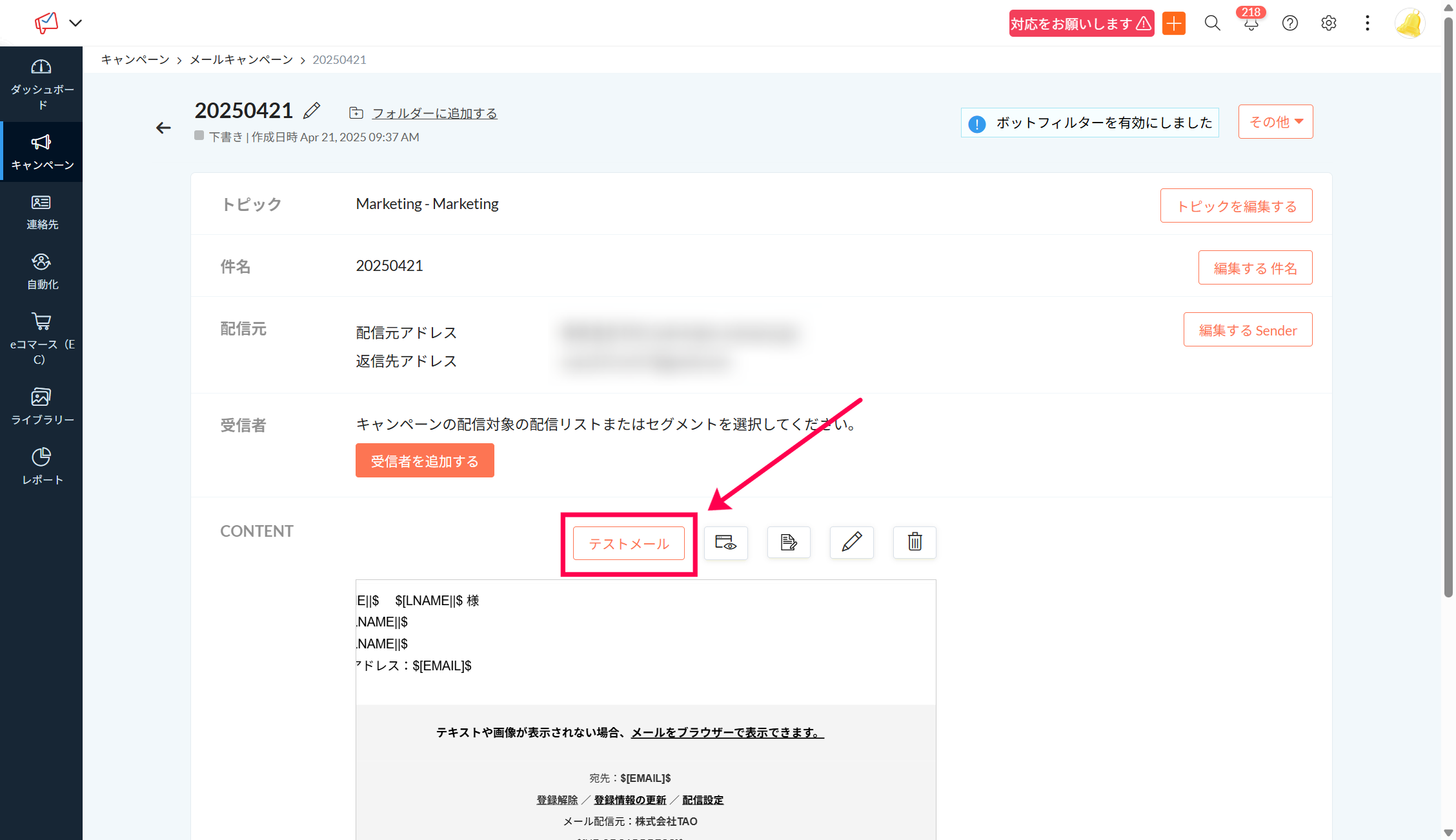 ※「下書き」ステータスのキャンペーンをクリックしてください。「配信済み」のキャンペーンはテストメールを送信できません。