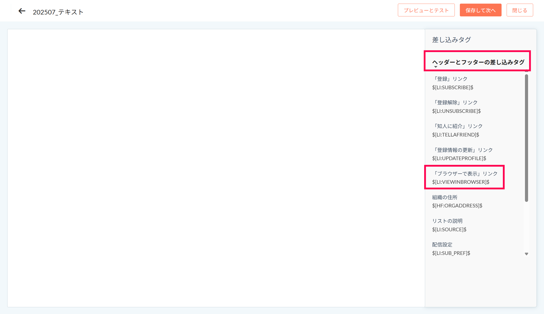 「ブラウザーで表示」リンクの差し込みタグ(=$[LI:VIEWINBROWSER]$)を挿入していただくことで、実際にテキストキャンペーンを送信した際に、URLが表示されるようになります。