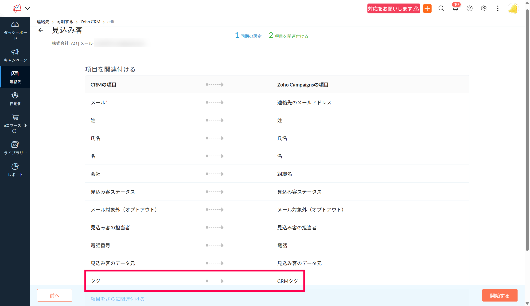 Zoho Campaigns上での同期の設定:項目の関連付けで、