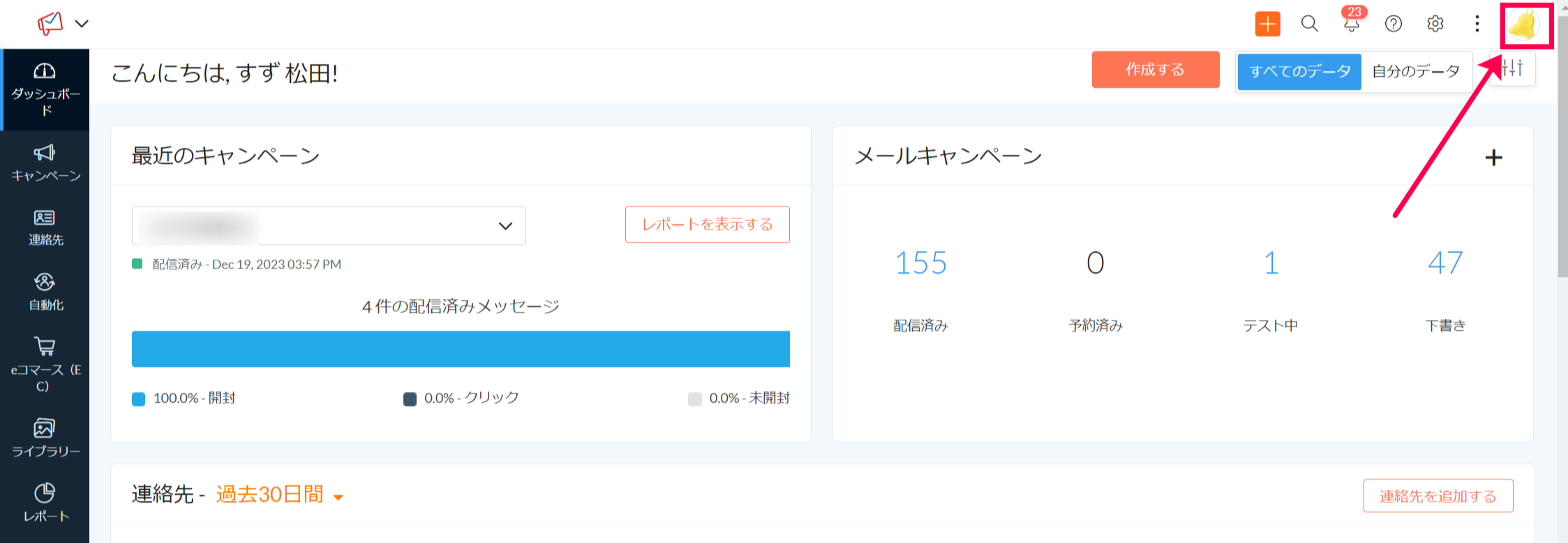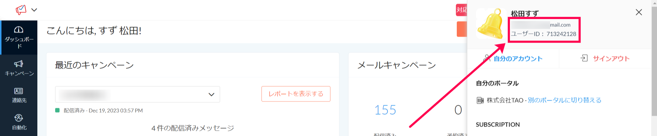 ユーザーのメールアドレスとZohoのユーザーIDは、Zoho Campaigns画面右上のユーザーアイコンをクリックすることでご確認いただけます。
