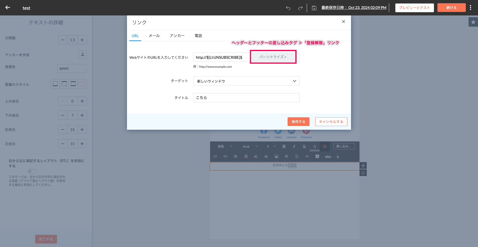 - パーソナライズ>ヘッダーとフッターの差し込みタグ>「登録解除」リンク をクリック