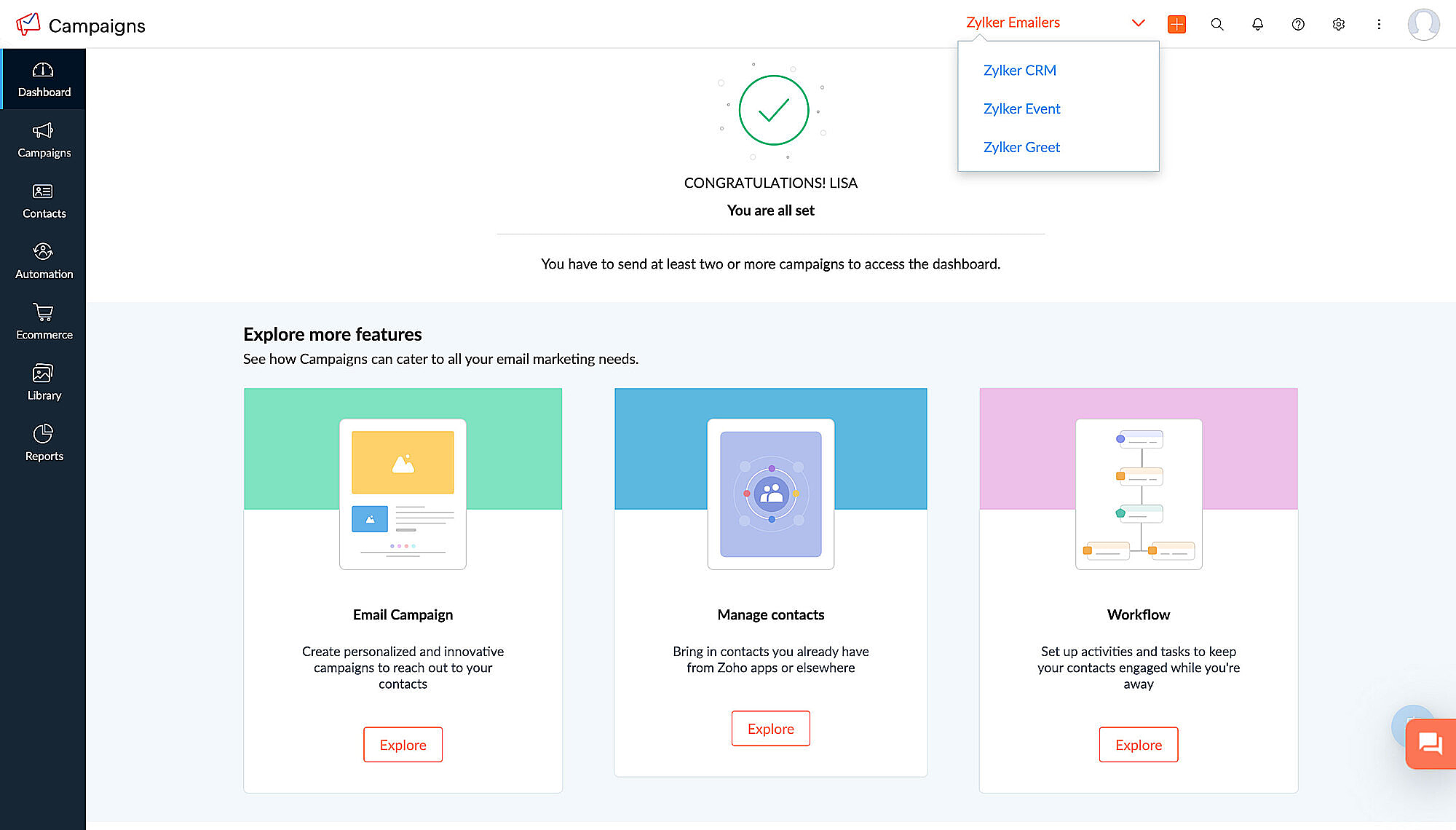 - Zoho Campaigns のワークスペースは、1つのアカウントでビジネスのさまざまな側面を整理して管理するための実用的なソリューションを提供します。