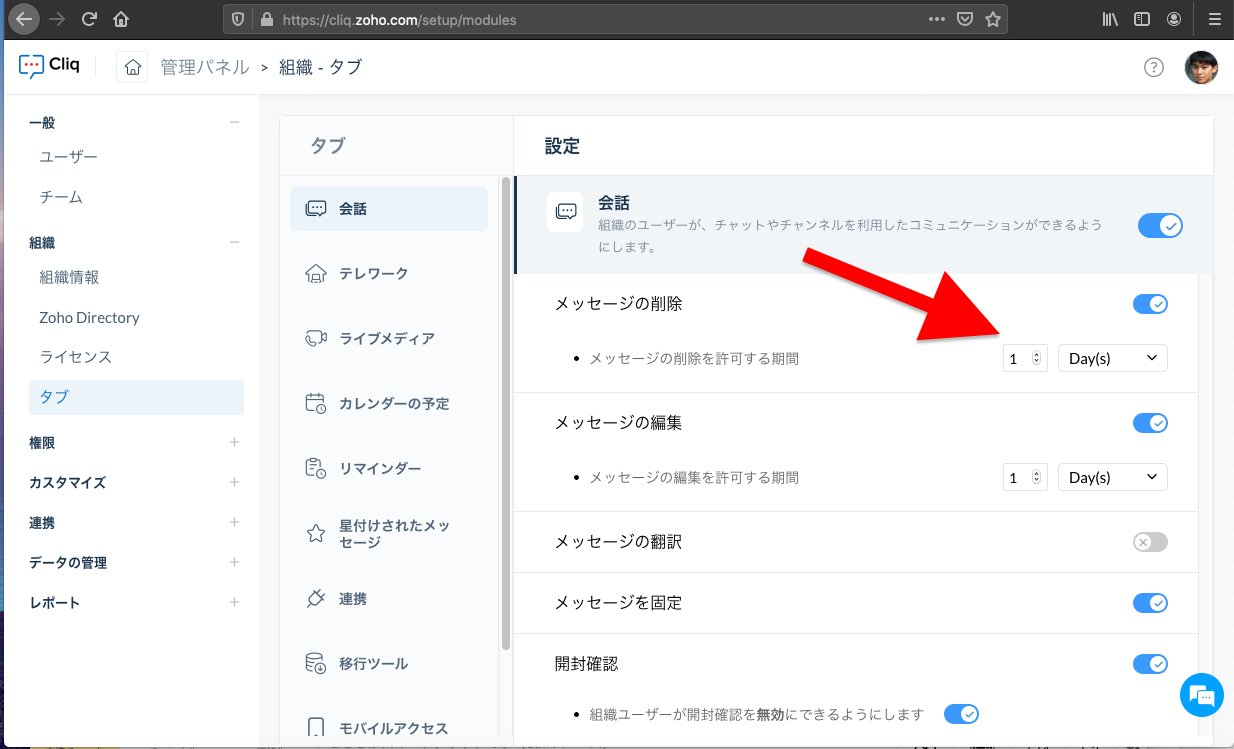 次に、「組織」->「タブ」->「会話」から、メッセージを削除する時間制限を設定できます。