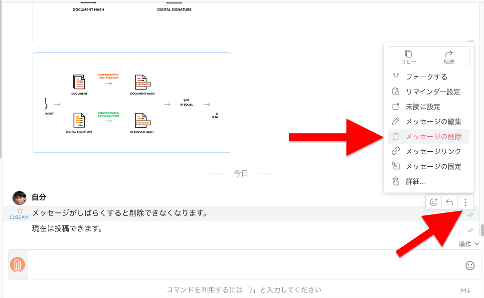 メッセージの削除には投稿してからの制限時間がございます。これは、管理者が最小1分から最大730日まで設定できます。また、メッセージの削除をチャット全員に知らせる情報も表示されます。