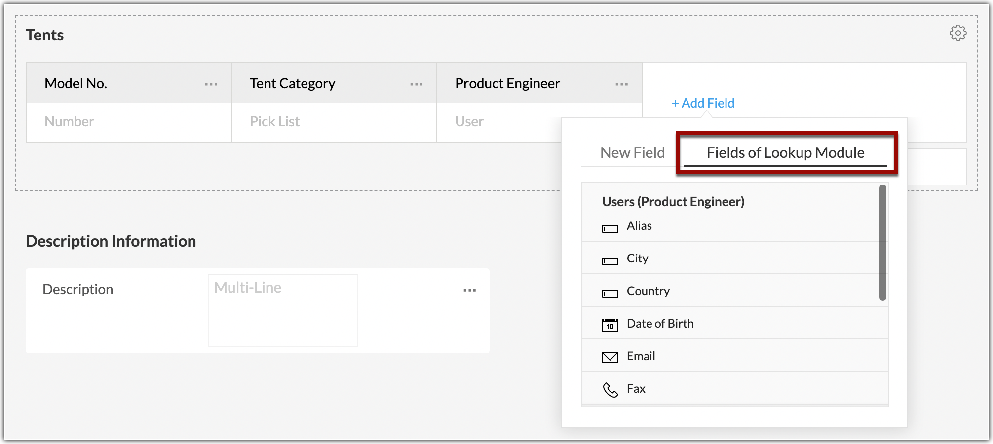 テントに関するサブフォームデータが作成されるたびに、それぞれの製品エンジニアをそのサブフォームデータに関連付けることができます。これにより、顧客から技術的な詳細を求められたときに、サポート担当者はサブフォーム内のユーザー項目を確認することで、連絡すべき製品エンジニアを特定できます。ユーザーや製品エンジニアに関するその他の詳細(メールアドレス、経験年数、Skypeの詳細など)も同様に、サブフォーム内のデータに関連付けることができます。