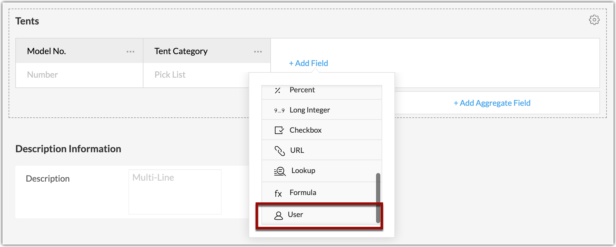 たとえば、上記のテントカテゴリーのサブフォームには、キャンプ用テント、屋上用テント等の詳細、モデル番号やテントの種類などのテントに関する詳細が含まれています。同じサブフォームに、製品エンジニア用のユーザー項目を設置する場合があるかもしれません。