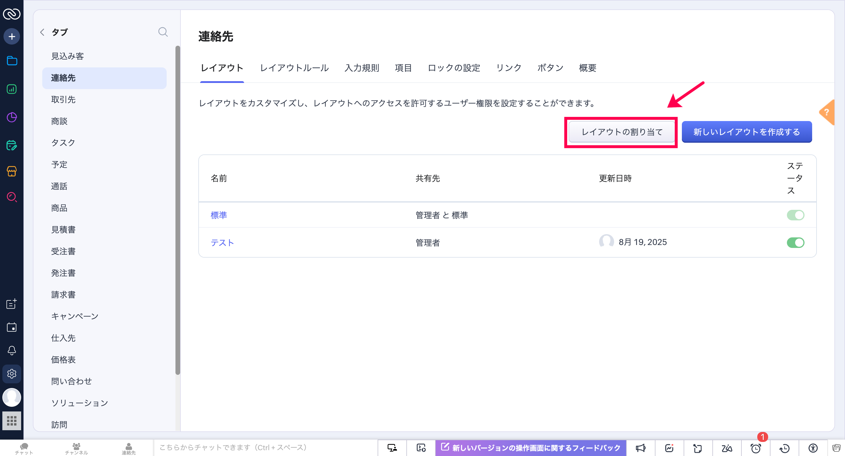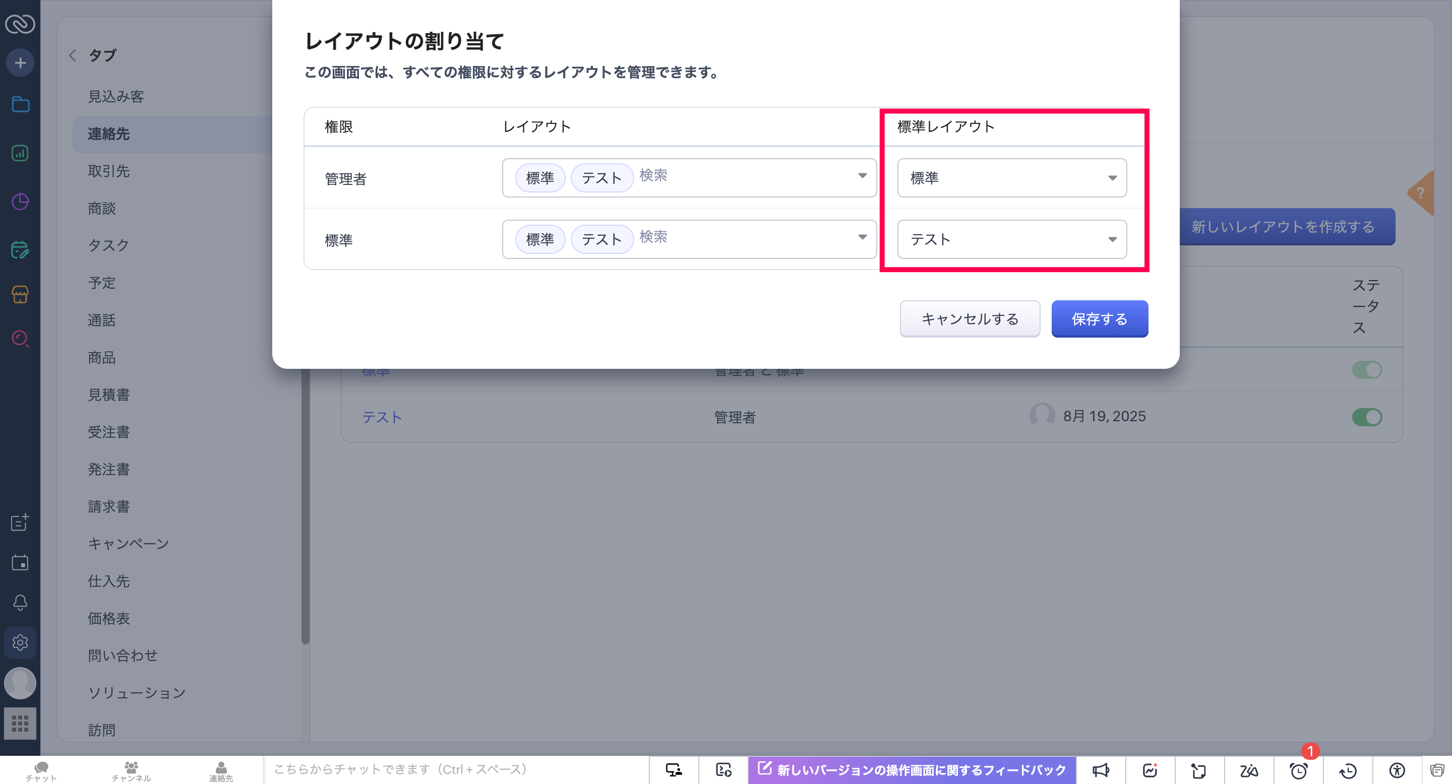 Zoho CRMで新規作成時に表示されるページレイアウトは、権限ごとの「レイアウトの割り当て」設定によって決まります。