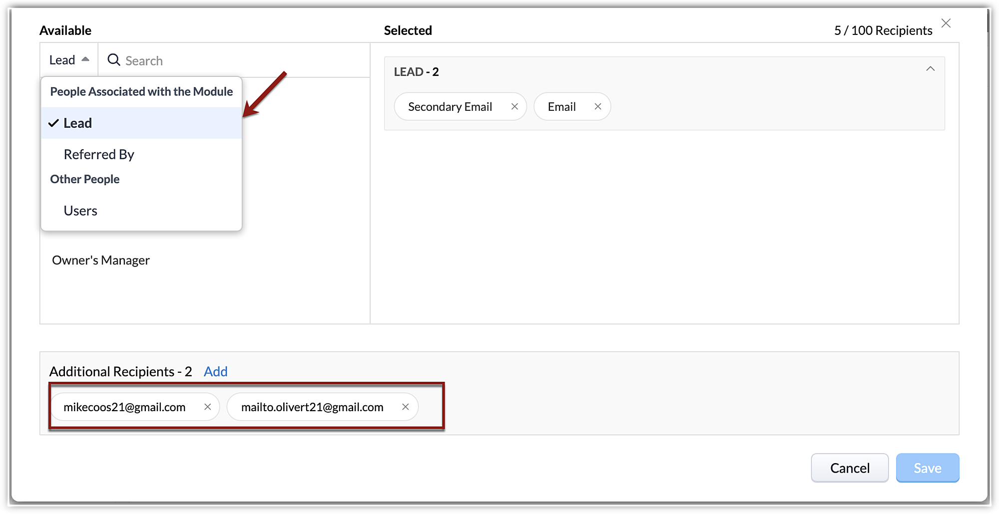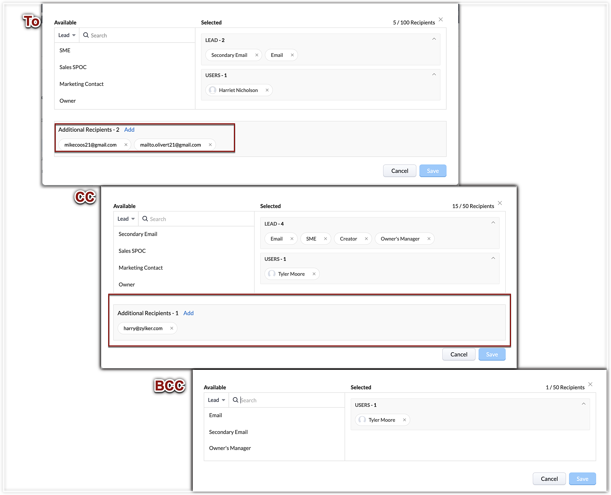 - 宛先、CC、BCCにユーザー(受信者)を追加することができ、通知に関連するすべての受信者が表示されます。