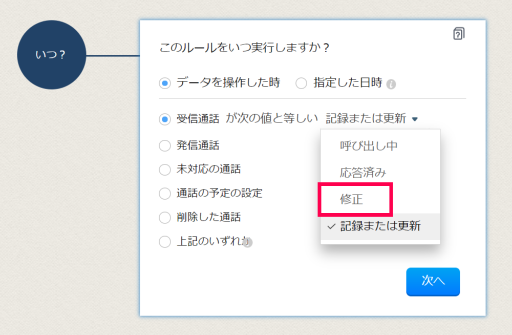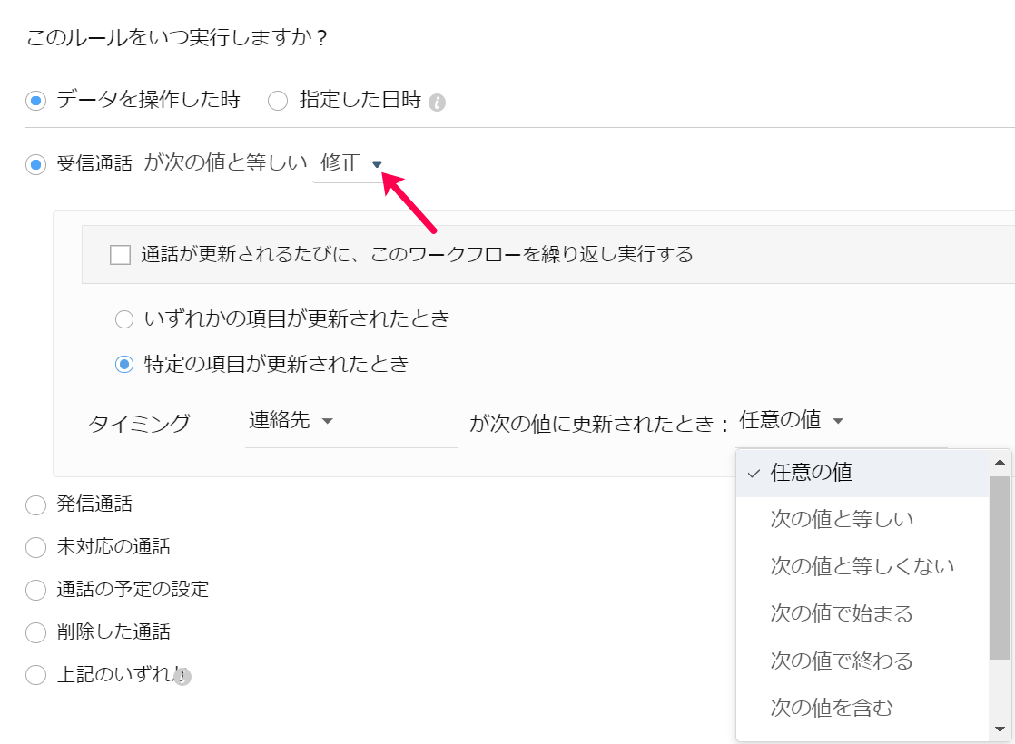 今回のアップデートにて、通話のワークフローで、新たなトリガー:「修正」が導入されました。