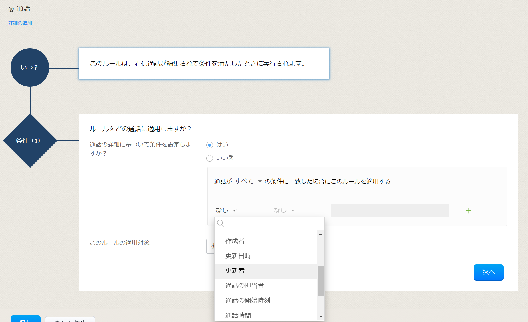 通話タブでは、通話が呼び出し中、未対応、記録または更新時等、様々な段階でワークフローを作動させることが可能でございます。