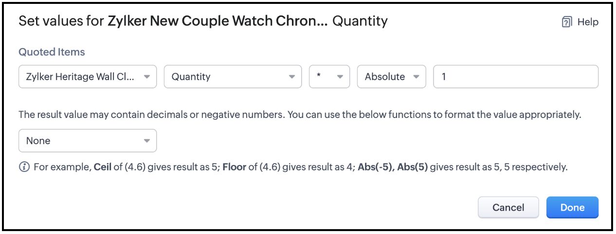- カップル時計の数は、注文された壁掛け時計の数と等しくなければならないため、無料商品の数量は、基準商品の数量に基づいて、見積書の中で「動的に」変更される必要があります。この場合、計算式は「基準商品の個数 * 固定 1」となります。