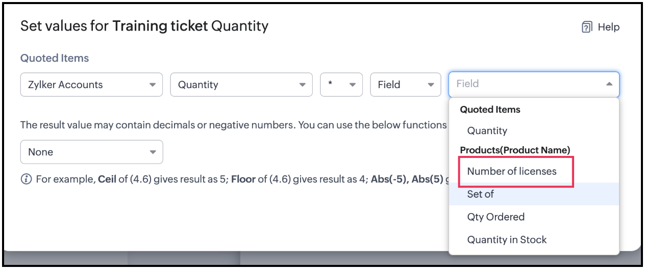 Zylker Tech というソフトウェア会社の例を考えてみましょう。すべてのビジネスアプリケーションの購入に対して、トレーニングチケットを提供する必要があります。トレーニングチケットの数は、注文数量ではなく、1回の注文で購入されるライセンス数によって決まります。したがって、この場合の計算式は、「基準商品の個数 * ライセンス数」となります。
