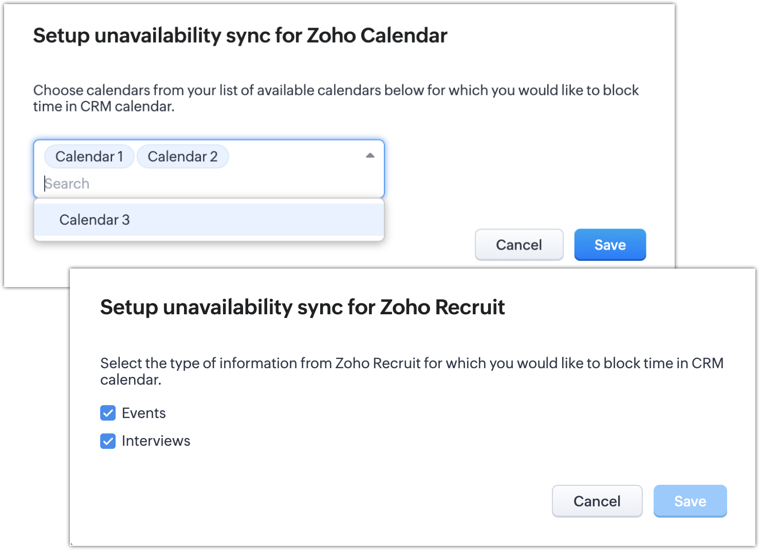 - Zoho Calendarでは、予定を同期したいカレンダーを選択できます。Zoho Recruitでは、予定とは別に、面接を選択することもできます。