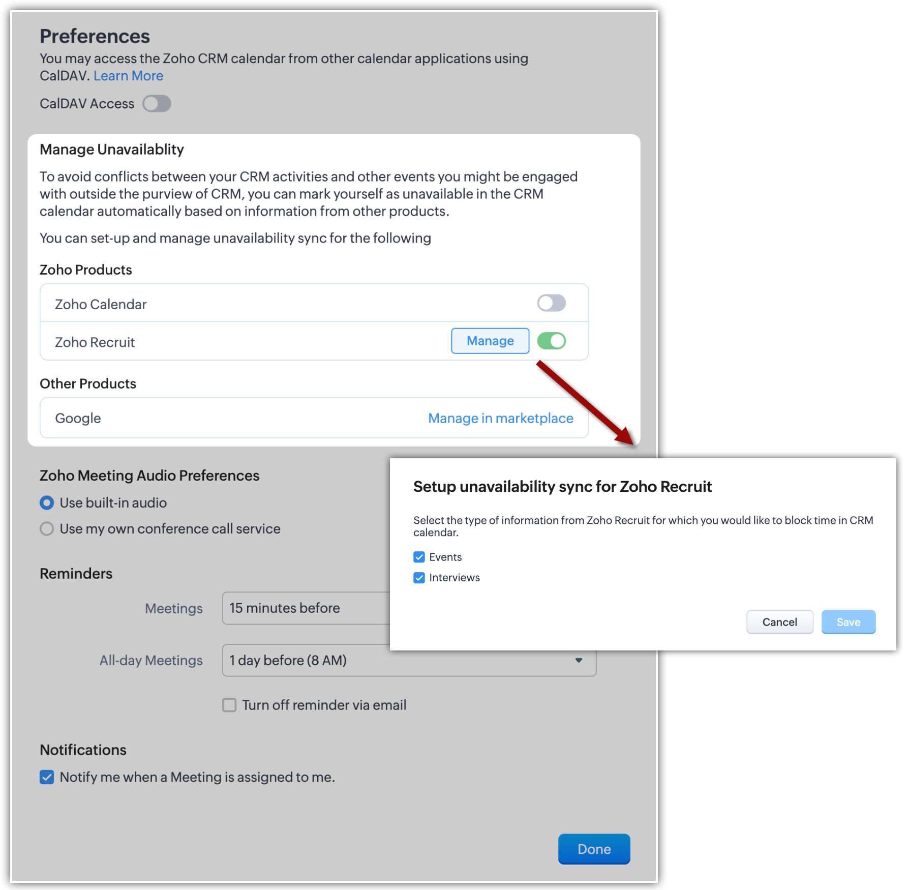 この機能アップデートにより、Zoho CalendarとZoho Recruitから、業務上のニーズに応じて、CRMのカレンダーで「予定あり」と設定するか否かを選択できるようになり、CRMの活動とCRM以外の他の業務とのスケジュールの競合を防ぐことができます。