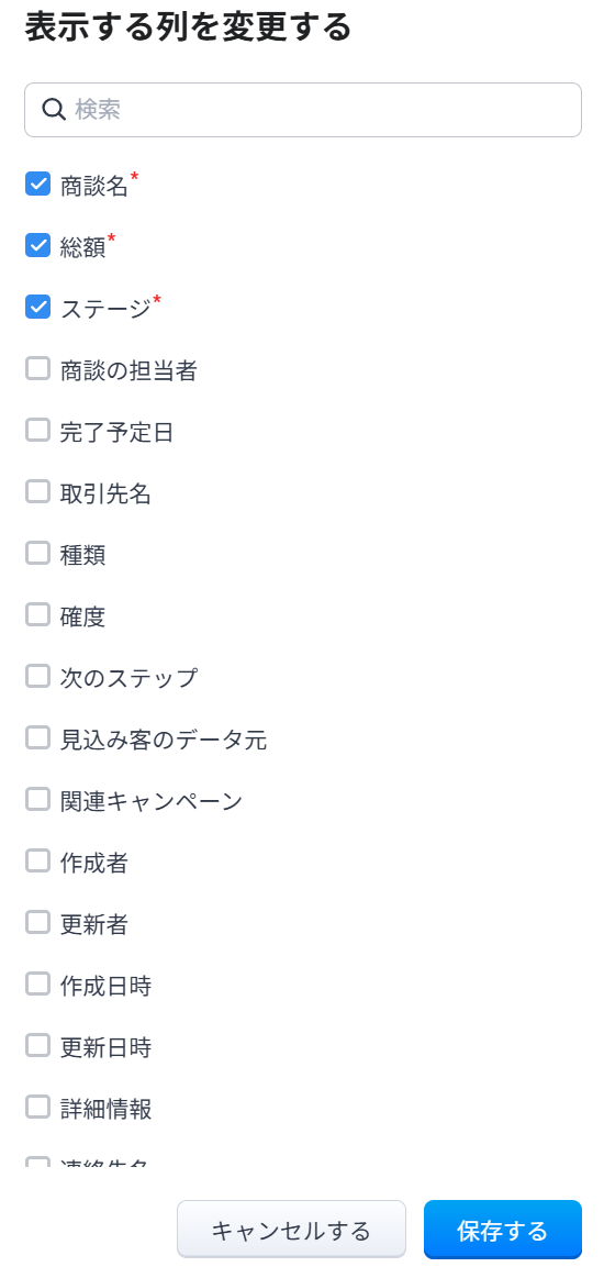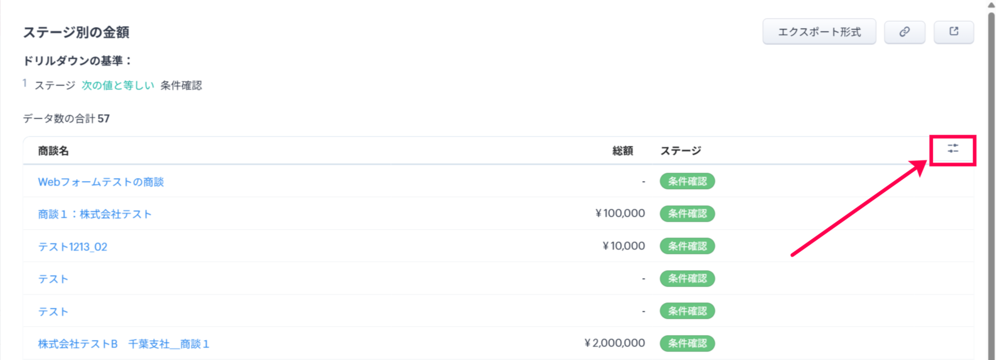 例えば、商談に関するグラフをクリックした場合、商談名や総額などが表示されますが、この表示項目を増やしたり、列の並びを変更することは可能でしょうか?