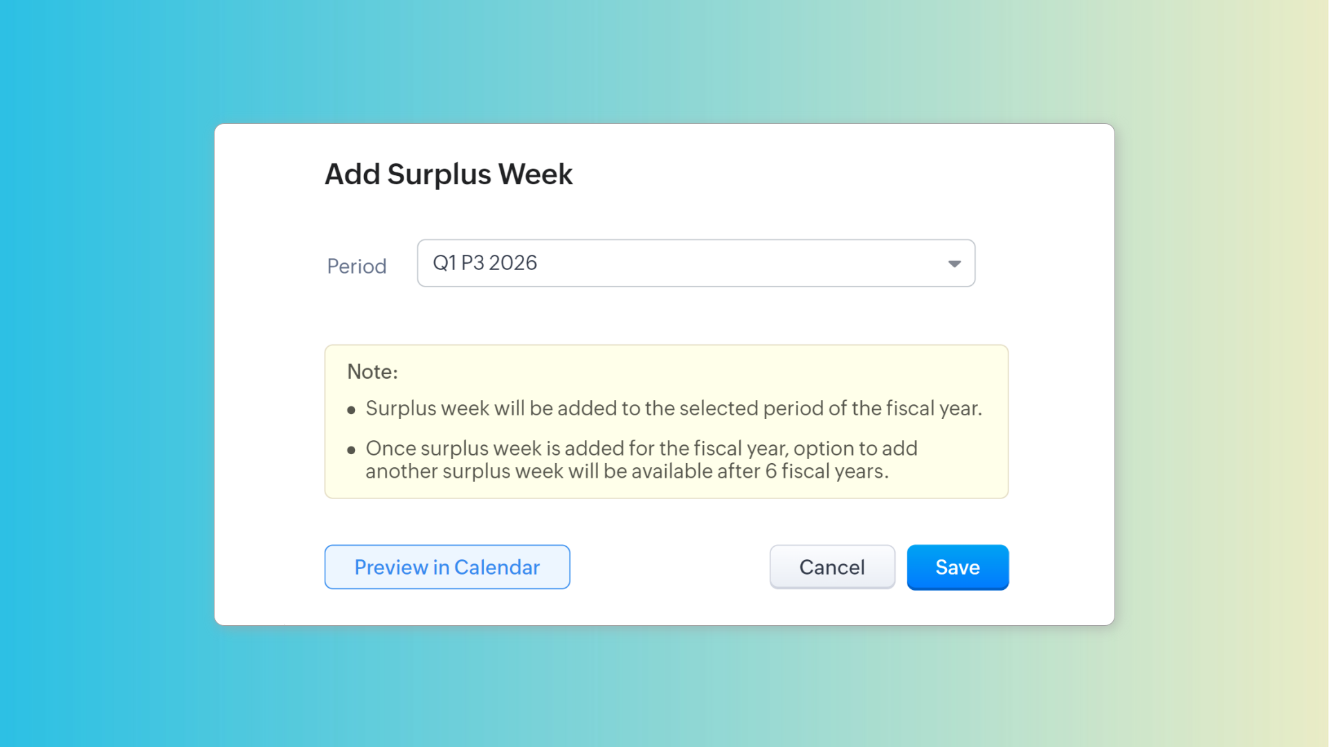 独自の会計年度形式では、1年を52週(364日)に分割するため、毎年余りの日が生じます。ニーズによっては、会計期間に週を追加する必要があるかもしれません。例えば、会計年度を常に4月の第1月曜日に開始したい場合には、余りの週を追加する必要があるかもしれません。この場合、特定の会計期間に週を追加して修正することができます。