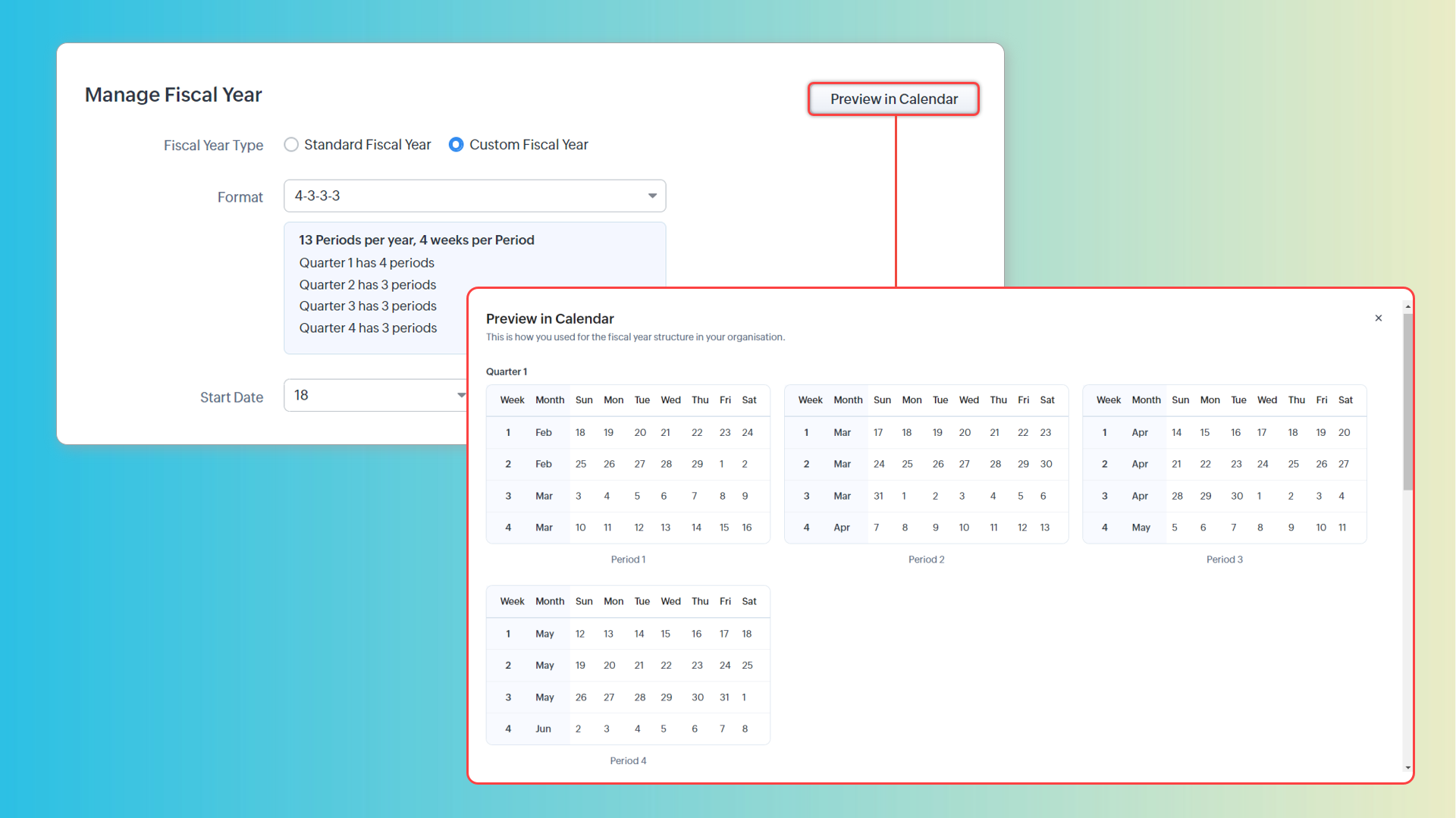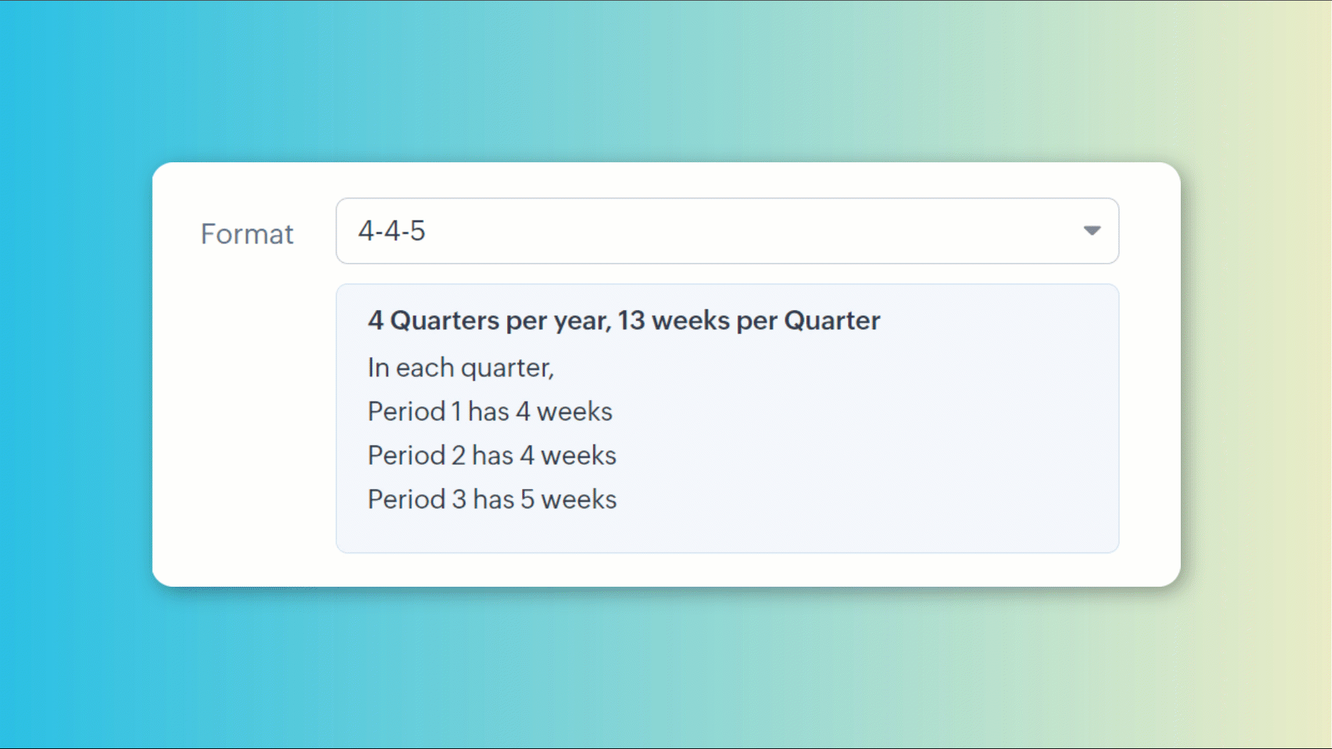 前述した7つの形式から1つを選ぶことができます。各形式を選択すると、選択した形式が四半期、期間、週単位でどのように設定されるか確認できます。