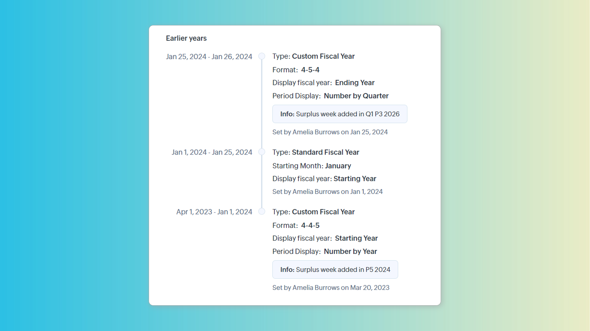 会計年度タブで会計年度の変更履歴を確認することができます。独自の会計年度形式の履歴については、カレンダー形式でプレビューできます。