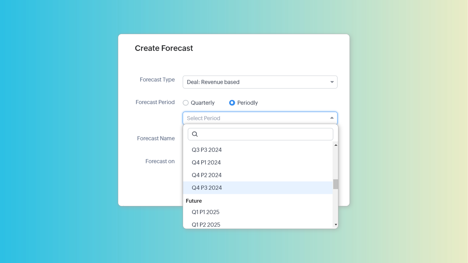 独自の会計年度が選択されると、四半期または期間に基づいて売上予測を作成することができます。「売上予測の期間」の「毎月」オプションは「定期」オプションに置き換えられます。