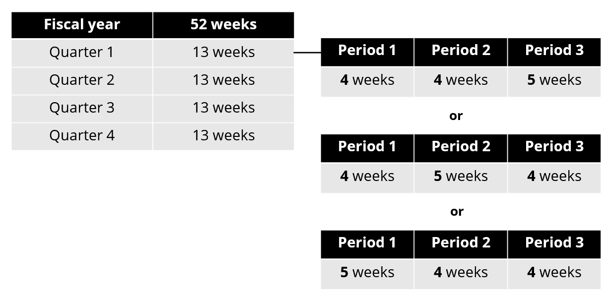 - 3-3-3-4、3-3-4-3、3-4-3-3、4-3-3-3:これらの年単位の形式では、各期間は4週で構成されています。会計年度は13期間で構成されます。これらの期間は、3-3-3-4、3-3-4-3、3-4-3-3、4-3-3-3の4つの四半期にまたがっています。名称は、これら4つの四半期のそれぞれの期間数を示しています。