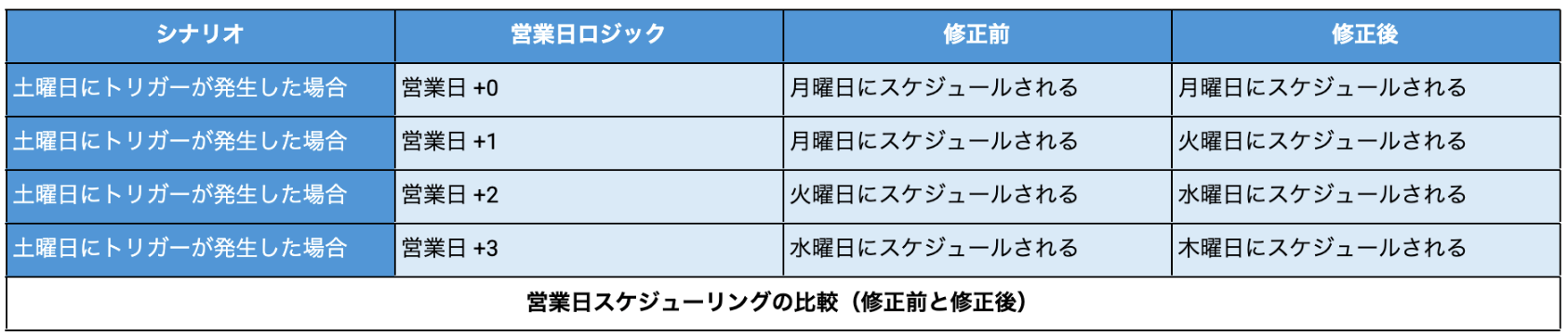 このアップデートによりワークフローが動作しなくなることはありません。営業日の計算ロジックを修正し、スケジュールが一貫した動作となるように改善しただけです。