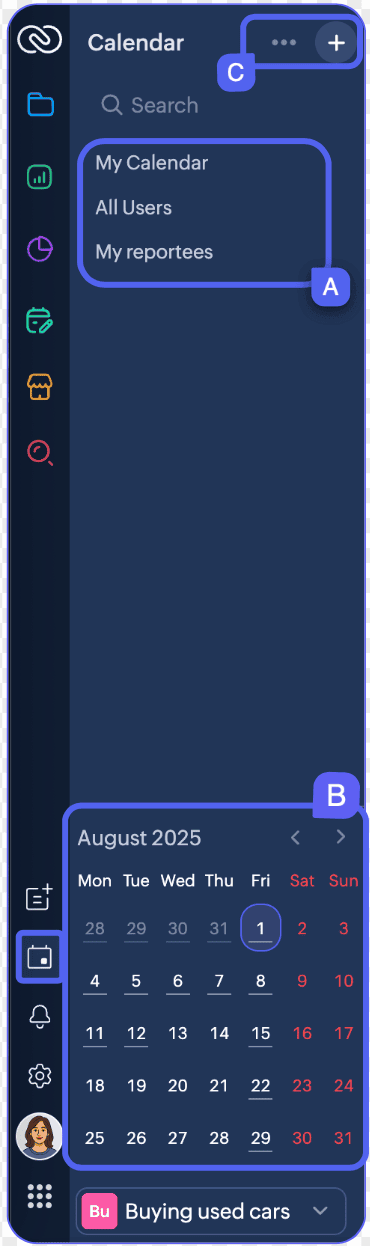 - カレンダーの一覧:自分のカレンダーと共有されているカレンダーが、この折りたたみ可能なメニューバーの一部として表示されます。