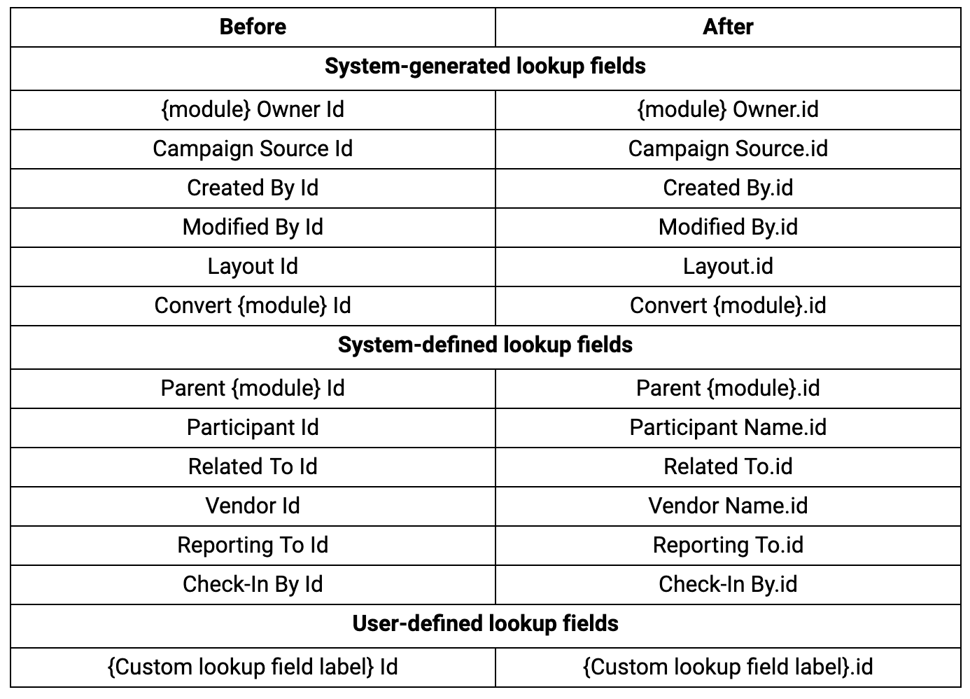 以前は、これらの項目名は 「(スペース)ID 」で終わるように設定されていましたが、現在は 「(ドット)ID 」で終わるように設定されています。例えば、 「取引先 Id」は 「取引先名.id」に変更されました。