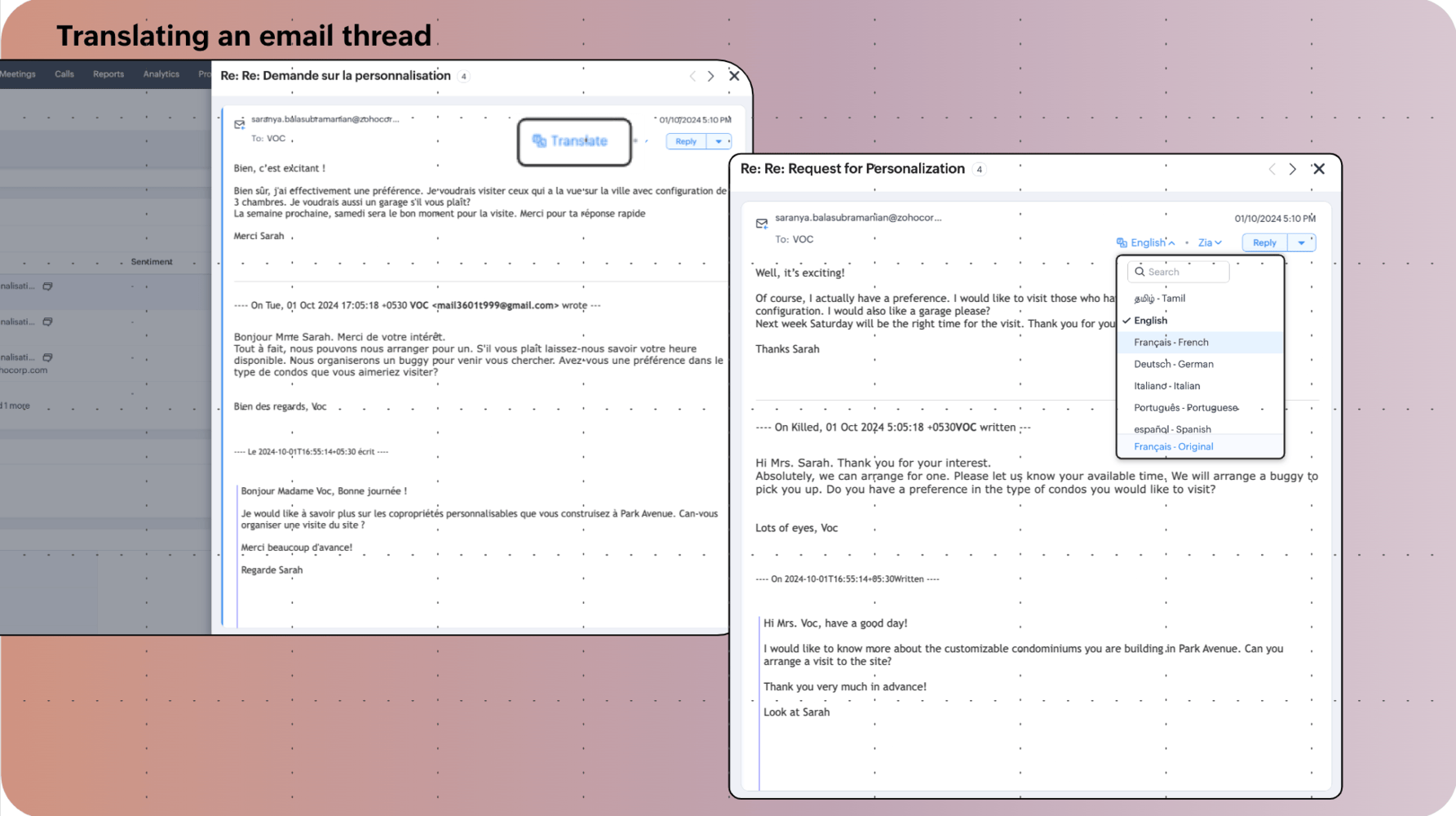 言語が障害となることなく彼らとビジネスを行い、スムーズに会話を行うために、Zoho CRMのすべてのメールで翻訳機能を提供しています。