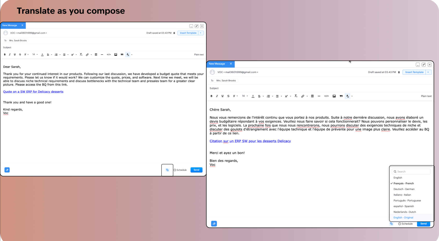 ボタンをクリックすると、ディスプレイ内のすべてのコンテンツが翻訳されます。メールの作成、受信および送信されたメール、およびメールスレッドの作成に適用されます。