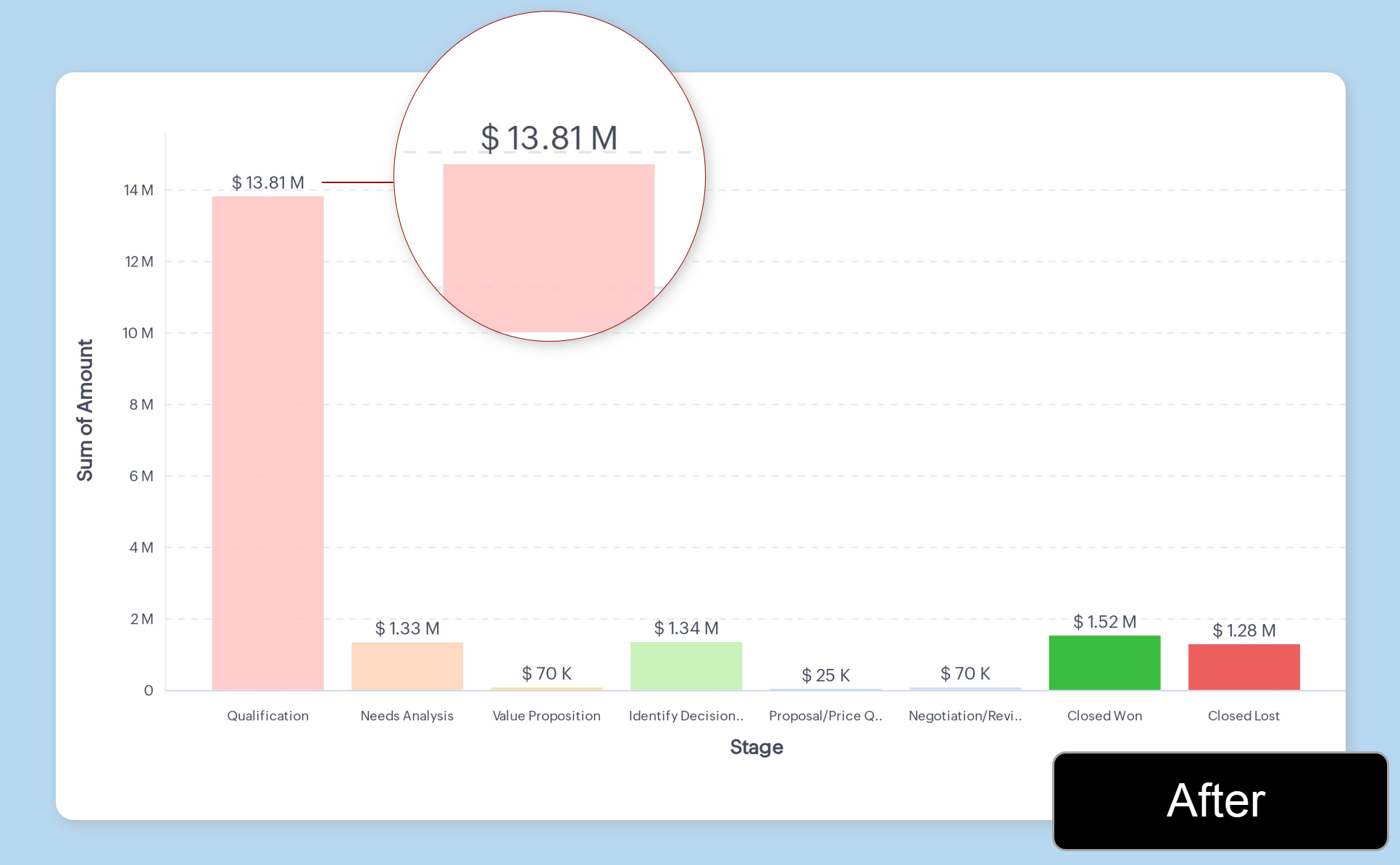 例えば、月次収益が複数の商談のデータを集計して計算されるCRMでは、商談数と収益の両方を表示することで、収益の増加が案件数の増加によるものなのか、平均商談規模の増加によるものなのかを簡単に理解することができます。