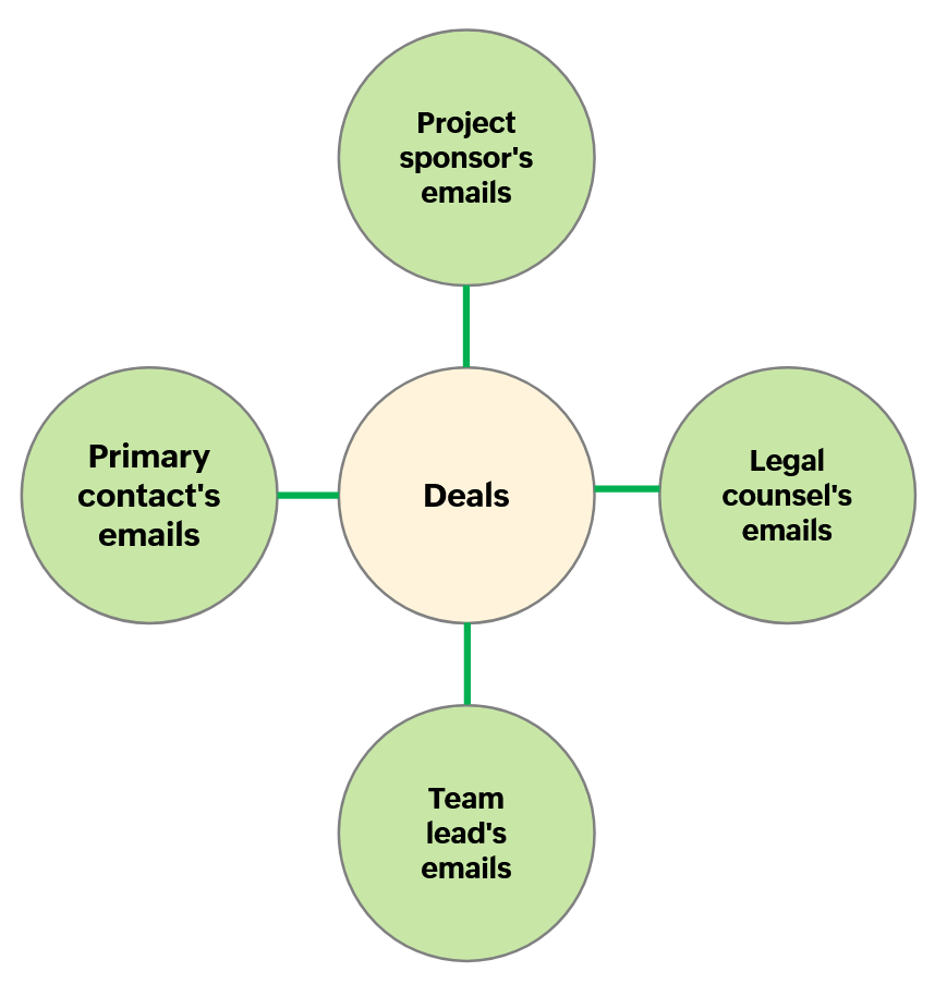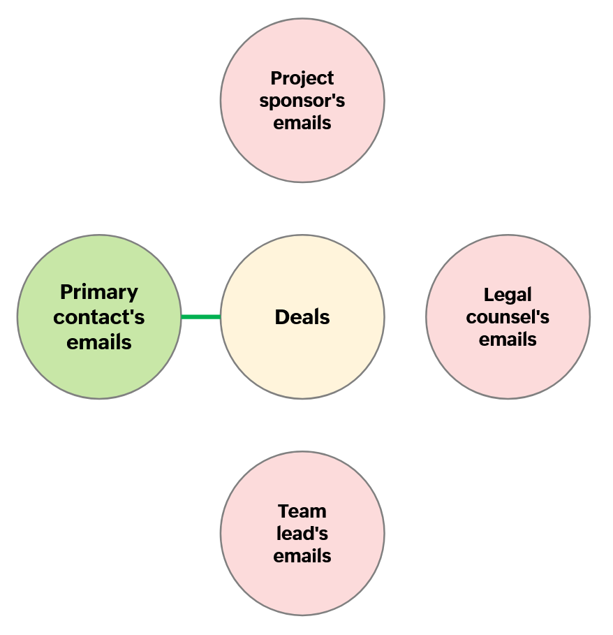 そのため、ある商談に関連するメールのやりとりを包括的に把握したい場合、毎回、個々の関係者(=連絡先の役割として追加されている連絡先)の受信トレイを調べて、それらのメールを探し出さなければなりませんでした。