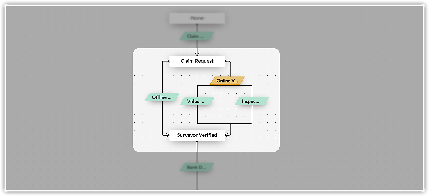 顧客から事故に対する車両保険の適用請求があった場合、承認処理の前に保険の調査員(鑑定人)による確認が必要です。調査員による確認には、損傷した車両の写真や動画を関連書類と一緒にオンラインで確認する方法と、損傷した車両を直接現場で確認(オフラインで確認)する方法と2通りあります。そこで、オンライン確認用の遷移と、オフライン確認(現場確認)用の遷移をそれぞれ作成します。