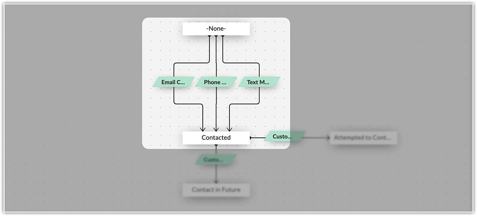 見込み客への連絡を例に説明します。担当者は、メール、電話、チャットの3つの方法で見込み客に連絡するとします。この3つの方法をそれぞれ別々の通常の遷移として作成します。図の例では、担当者はどの方法で見込み客に連絡しても、その方法に対応する遷移を完了すると、状態が、[なし](None)から[連絡済み](Contacted)に変わります(これに対して、並行遷移では、すべての遷移を完了した場合にのみ次の状態に変わります)。このように、いずれか1つの遷移を完了すれば次の状態に遷移(移動)する場合に、この方法が適しています。
