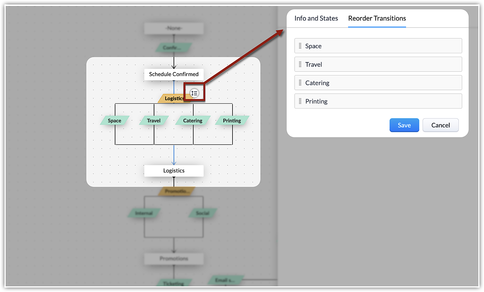 並行遷移では、サブ遷移の順番を並べ替えることができます。並行遷移においてメインの遷移にカーソルを合わせると表示される並べ替えアイコンから遷移の順番を変更することが可能です。