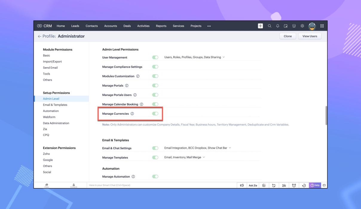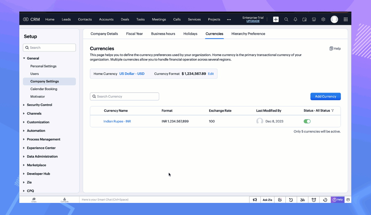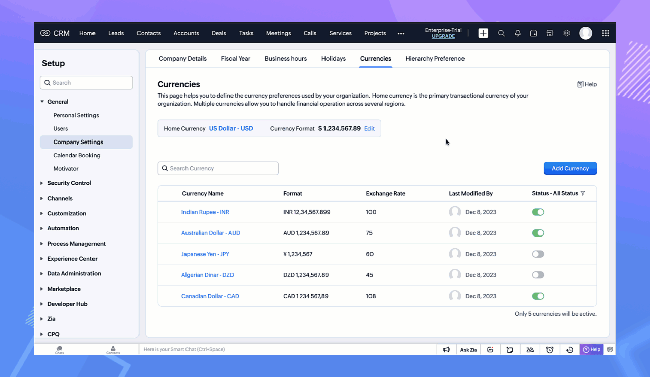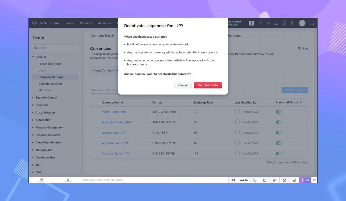 以前は、試用版のユーザーは、複数通貨機能がどのように動作するかを確認することができませんでしたが、今回のアップデートにて、Zoho CRMの試用版でも、複数の通貨が利用できるようになりました。有料版から試用版に切り替えたユーザーは、有料版の制限に応じて通貨を使用することができます。