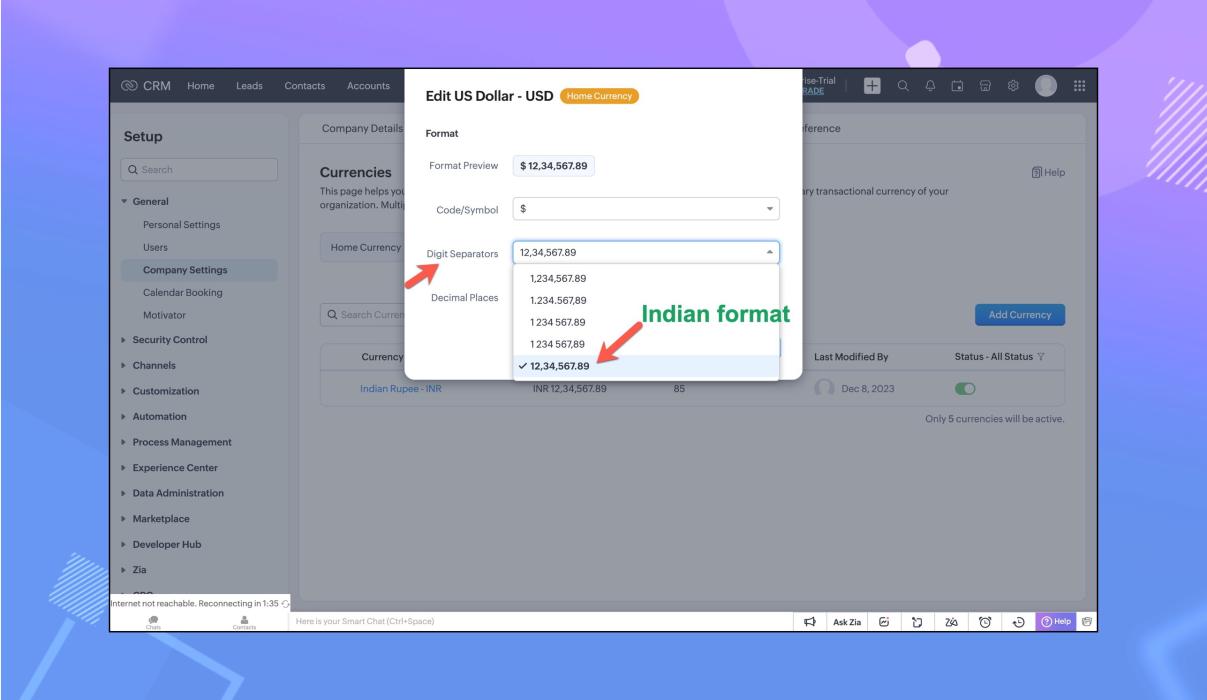 Zoho CRMが対応している既存の通貨記号に加え、さらにいくつかの通貨記号を導入し、財務管理を強化するために利用可能な通貨オプションの幅が広がりました。
