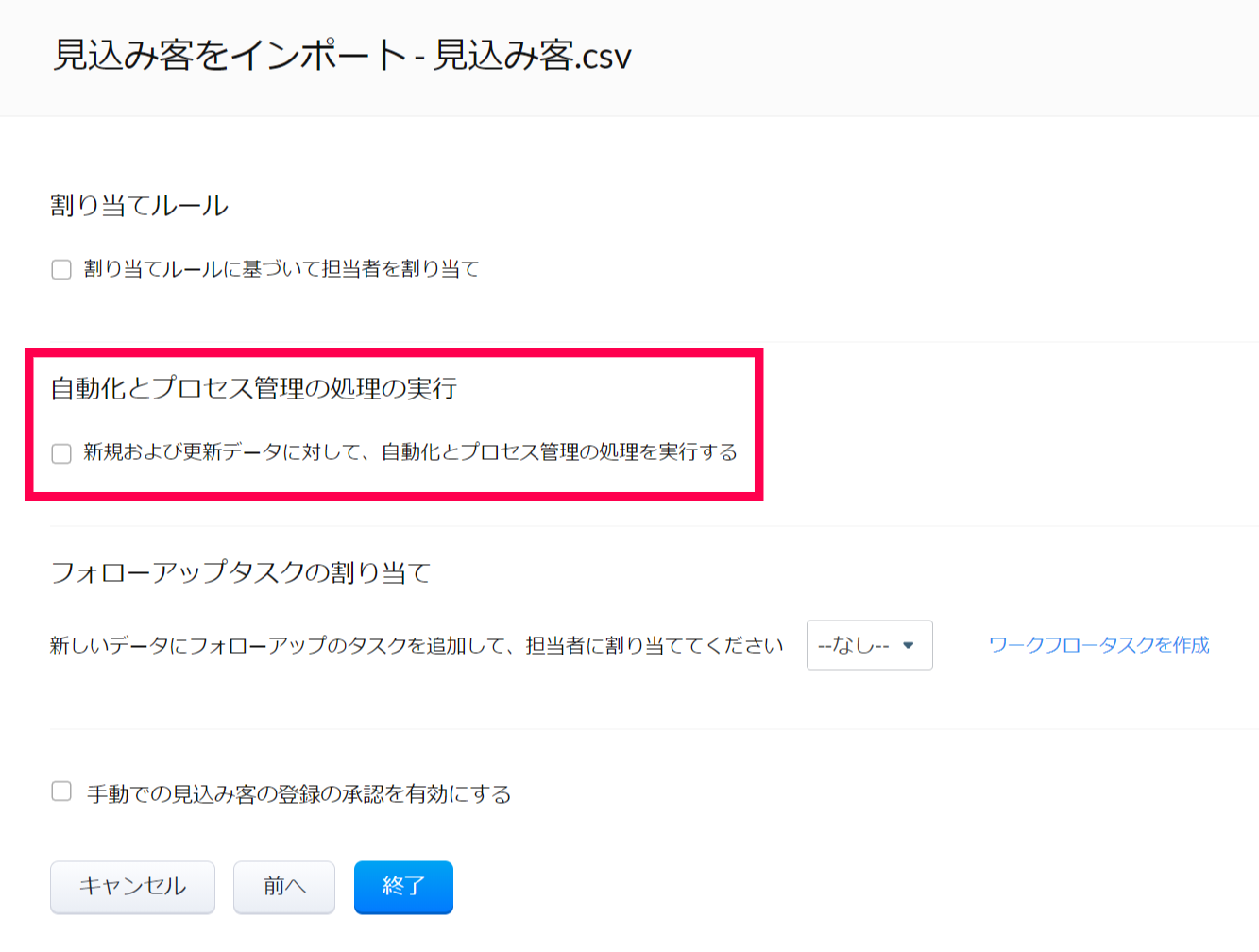 自動化処理やプロセス管理処理を実行するオプション」は、インポートファイル内に10,000以下のデータ列がある場合にのみ表示されます。