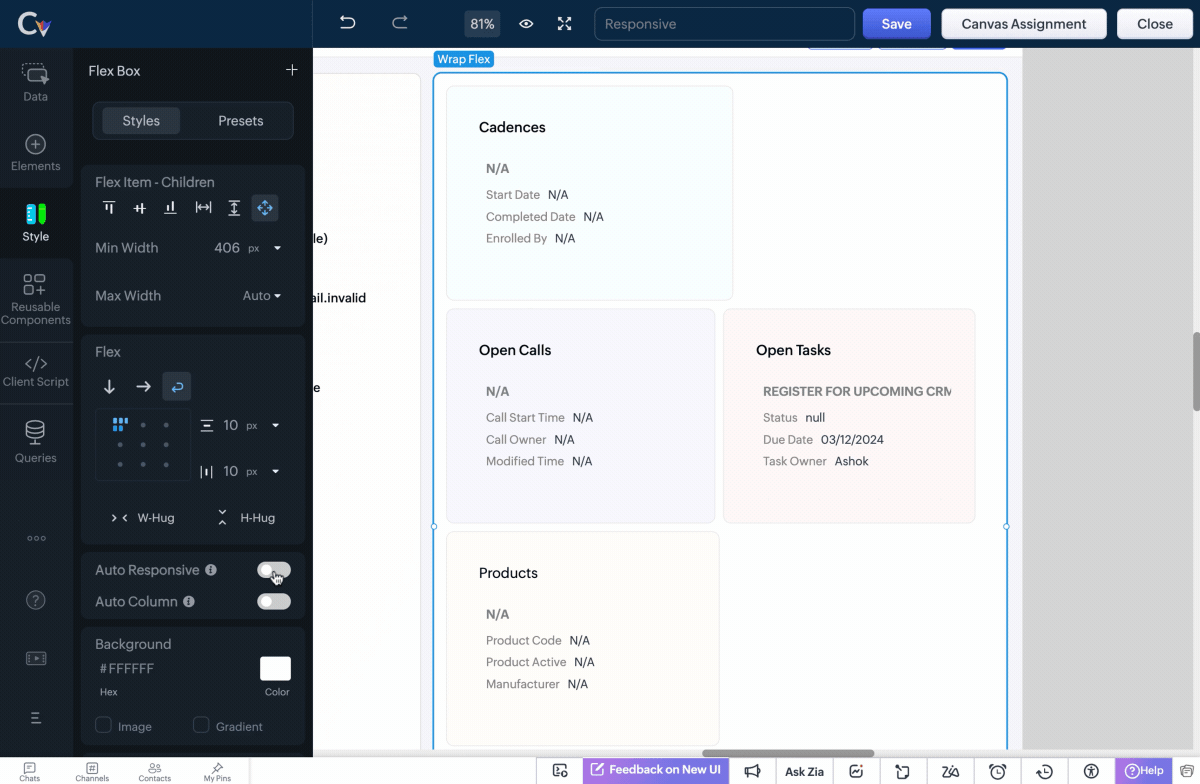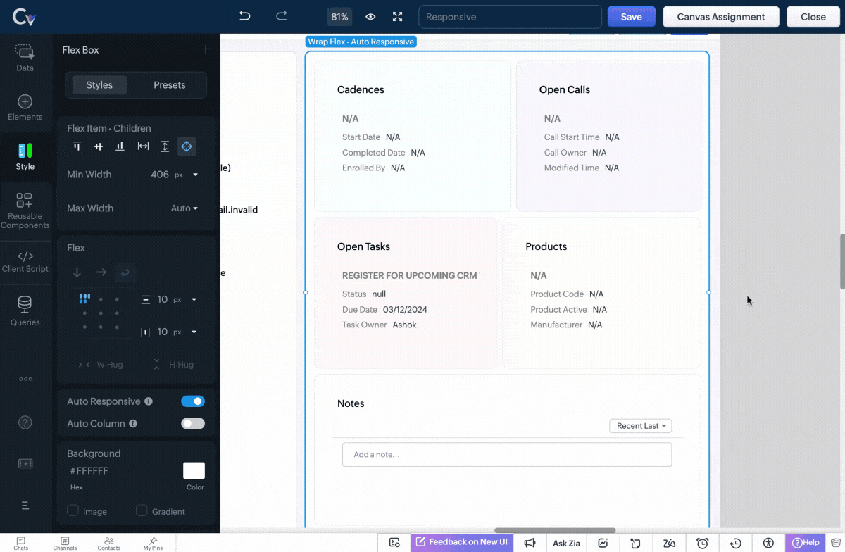 Zoho CRMのキャンバスの新しい要素、可変式ボックスをご紹介します。可変式ボックスを使用することで、レイアウト内のデータ表示方法をより自由にコントロールすることができます。この要素を使用すると、さまざまな画面サイズやデバイスに適応するレスポンシブレイアウトが可能になり、ユーザー体験が向上します。