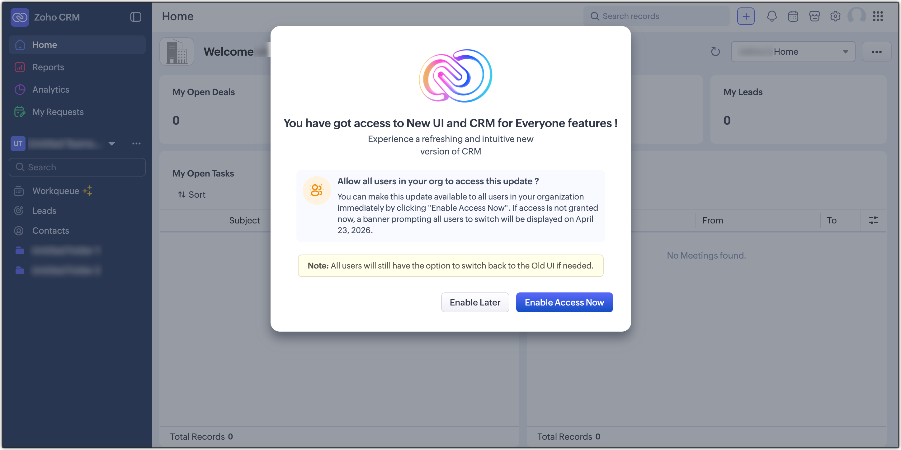50ユーザーを超える大規模な組織については、まず管理者に新しいUIを試すバナーを表示し、組織内の全ユーザーに対してZoho CRM For Everyoneを今すぐ有効にするか、後で有効にするかを選択できるようにします。