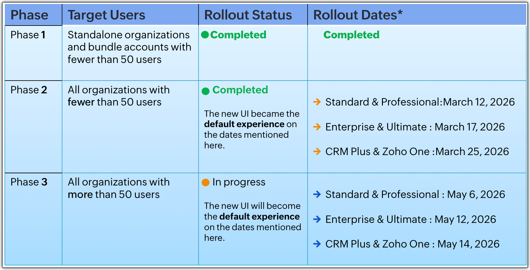 新しいZoho CRM For EveryoneのUIをすべてのユーザーのデフォルトとして展開し始めました。このアップデートは、組織の規模とアカウントの種類に基づいて、3つのフェーズに分けてリリースされます。