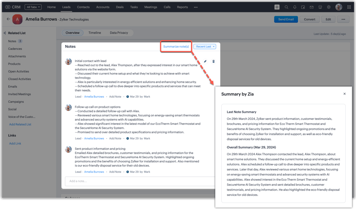 Zia(ZohoのAIアシスタント)によるメモの要約機能で、CRMのメモのやりとりの要点を簡単につかむことができるようになり、時間の節約と素早い意思決定に役立ちます。